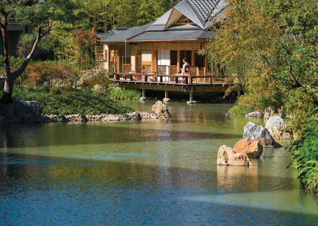 It helps that it stands, low-rise and discreet, aside a beautiful 800-year-old Shakusui-en pond garden, into which a waterfall flows and the rich colours of the foliage change in line with the seasons: cherry blossoms in spring, crape myrtle in summer, maple leaves in autumn, and plum blossoms in winter. It’s home to turtles and carp, herons fishing for a feed in the intoxicating sound of near silence, and you can soak in its unique atmosphere from a quaint Sukiya-style tea house, a delightful spot to sip locallymade sake as afternoon bleeds into evening.