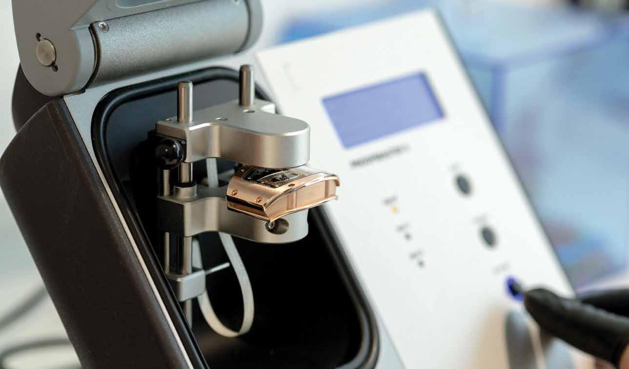 18K King Gold case set with diamonds. Self-winding movement. Interchangeable strap using patented One-Click system.