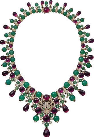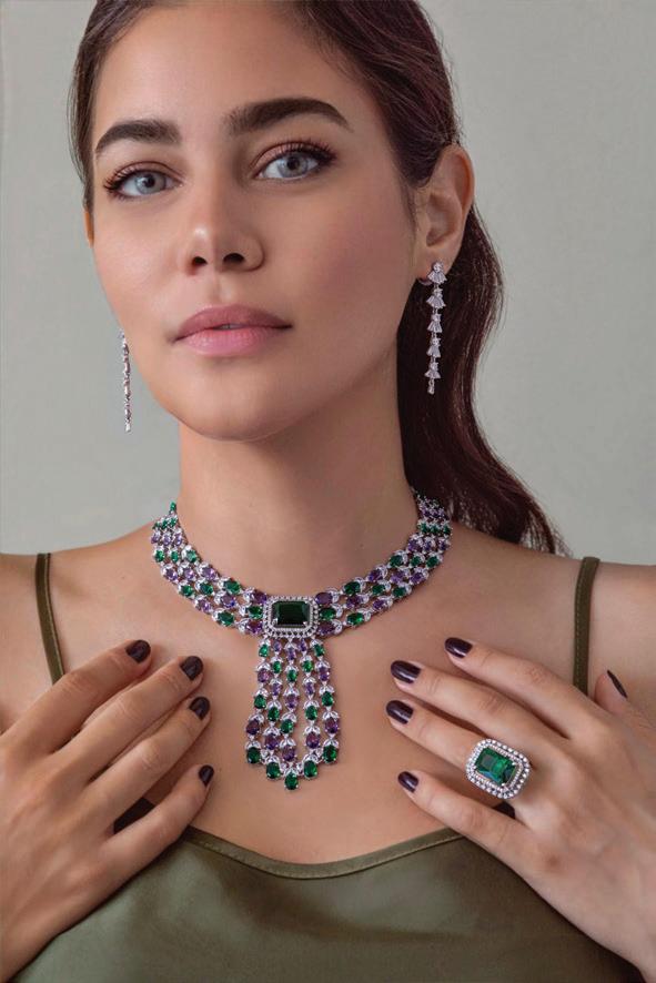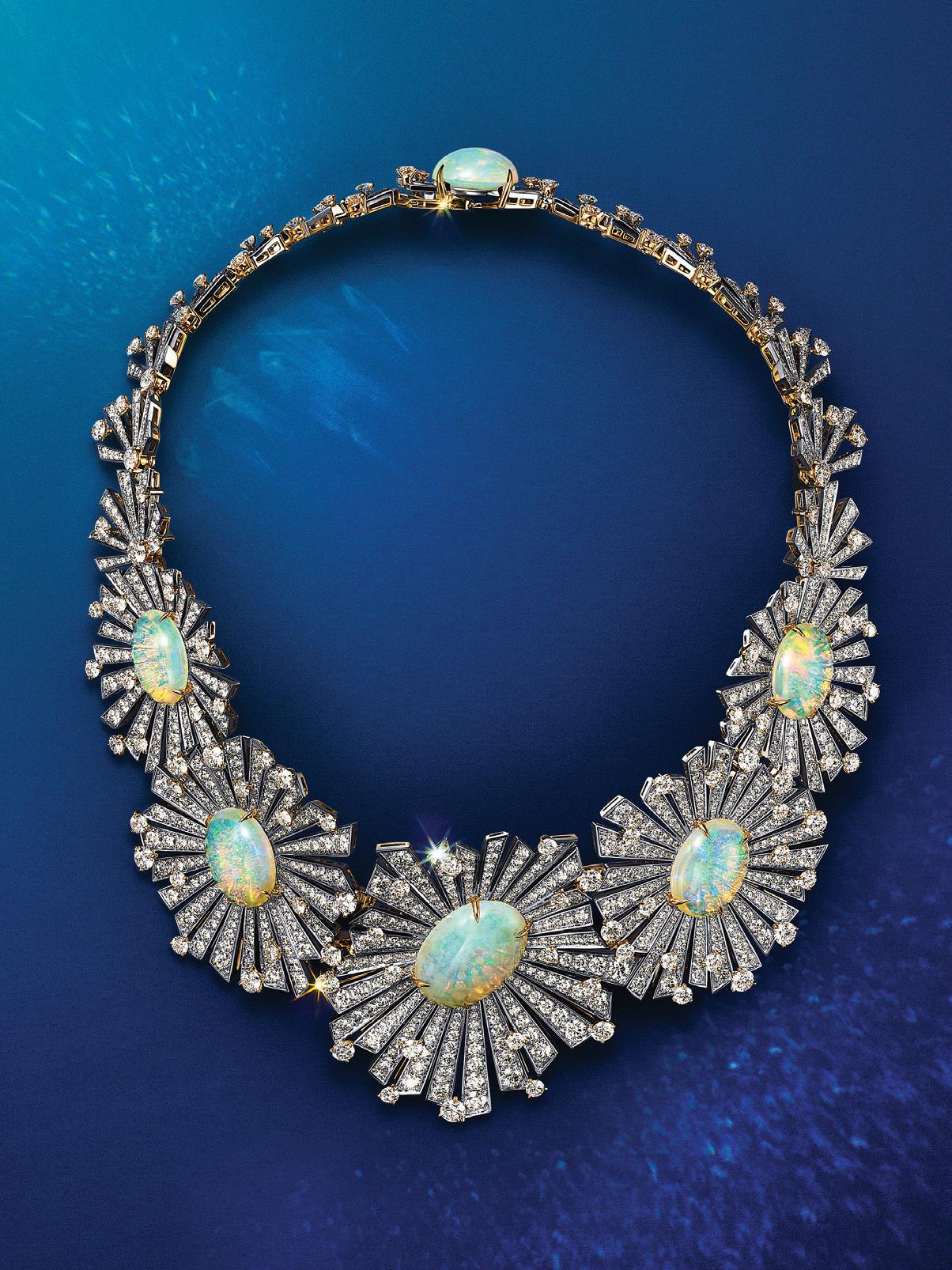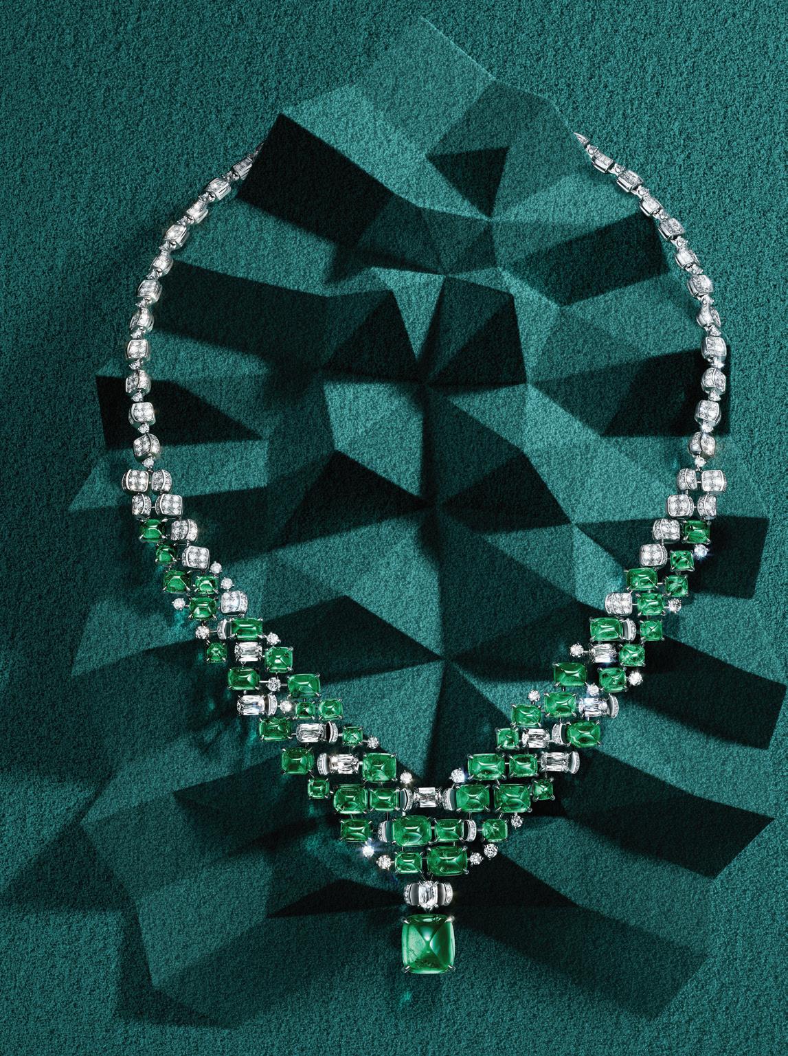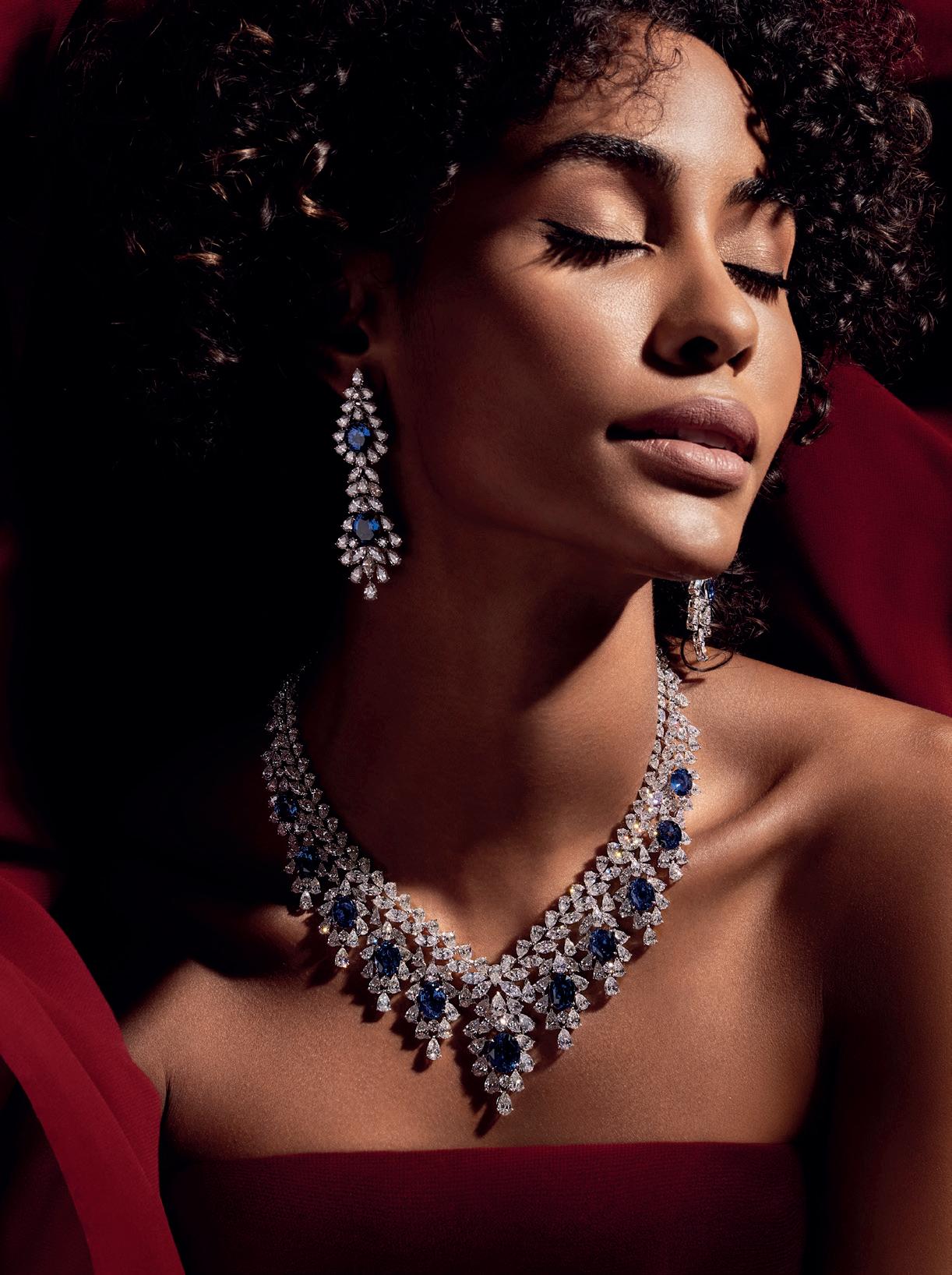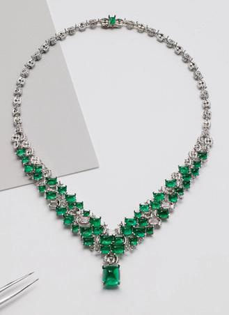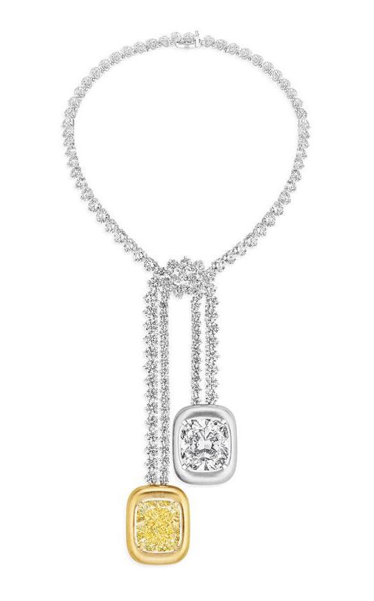 diamond, the other a 33-carat luminous white diamond, each enveloped in a satin-finished gold setting for a modern touch. With both necklaces also bedecked in diamonds, the piece boasts over 230 in total, with a combined weight of 129 carats.