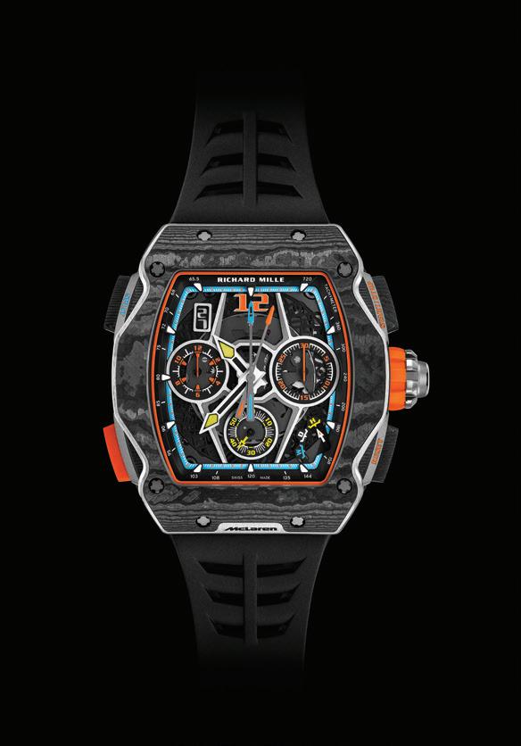 Richard Mille’s collaboration with supercar manufacturer McLaren has already birthed three boundary-shifting timepieces – including what was the lightest split seconds tourbillon chronograph in the world – but its fourth is arguably the most innovative. Based on the W1 – McLaren’s most powerful, fastest road car – Richard Mille was tasked with reflecting ‘the cutting edge, highperformance features of the car in terms of its shape, materials, functionality and the ‘engine’ that powers it.’ Naturally, Richard Mille has exceeded those expectations.