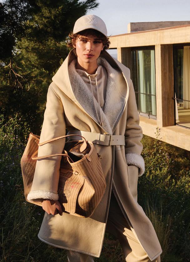 silk wrap coat is reversible, as is the capsule’s Neverfull Inside Out bag, the largest size of which comes liberally decorated with Flight Mode travel stamps. It’s a look repeated elsewhere across the collection, but best of all on a long silk skirt. Bon voyage.
