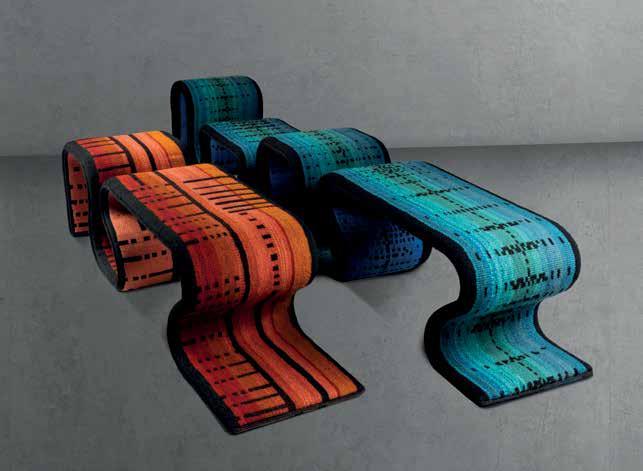 Natural dyes were used to colour the wool in authentic Bedouin tradition. Greens, for example, are from the leaves and branches of the ghaf tree, while black and white strands are produced from goat hair and sheep wool. The central spine of the design for the collection was based on the camel tooth pattern, which represents power and strength. Some of the weavers I work with are 80 years-old, so these are truly one-of-a-kind pieces. Functional as well as beautiful, the benches are art pieces and markers of knowledge and culture for future generations. loreta-art.com