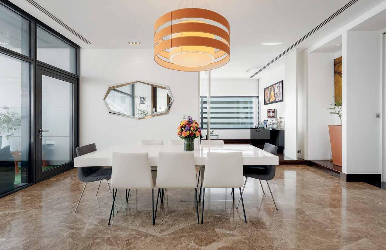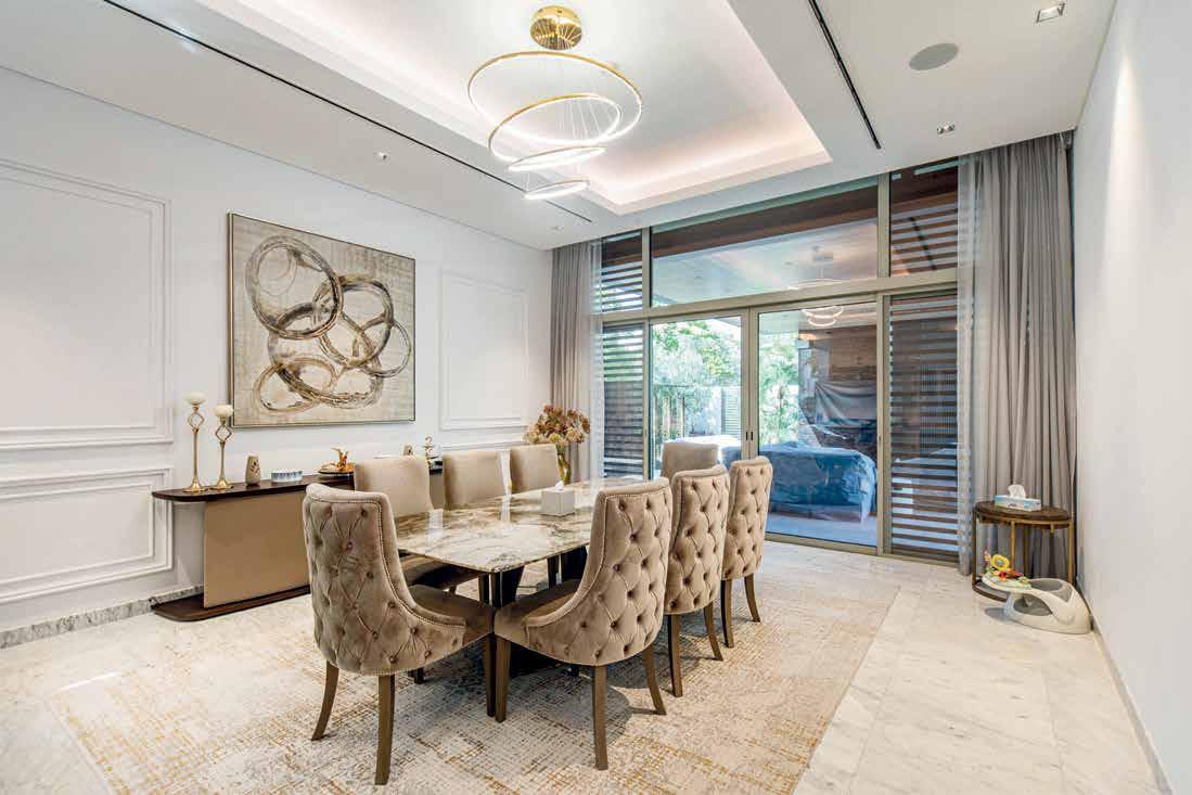 baseline tones are highlighted by vibrant accent pieces, including a stunning abstract painting in bright hues. The use of wood, marble, and brass materials gives a modern and elegant feel, further accentuated by customised wall panels. Most of the furniture items and soft furnishings were specifically designed for the client, ensuring both comfort and functionality while maintaining a timeless appeal. “The welcoming entrance area is a particular highlight and features a bespoke console with fluted door panels and a river stone terrazzo top, hand-decorated with beautiful artwork by Racha Elabbas.” The villa’s dining area also merits a mention, with eye-catching Masiero lighting pendants and a bespoke dining table topped with a three-metre-long marble slab from homegrown UAE concept brand, The Line.
