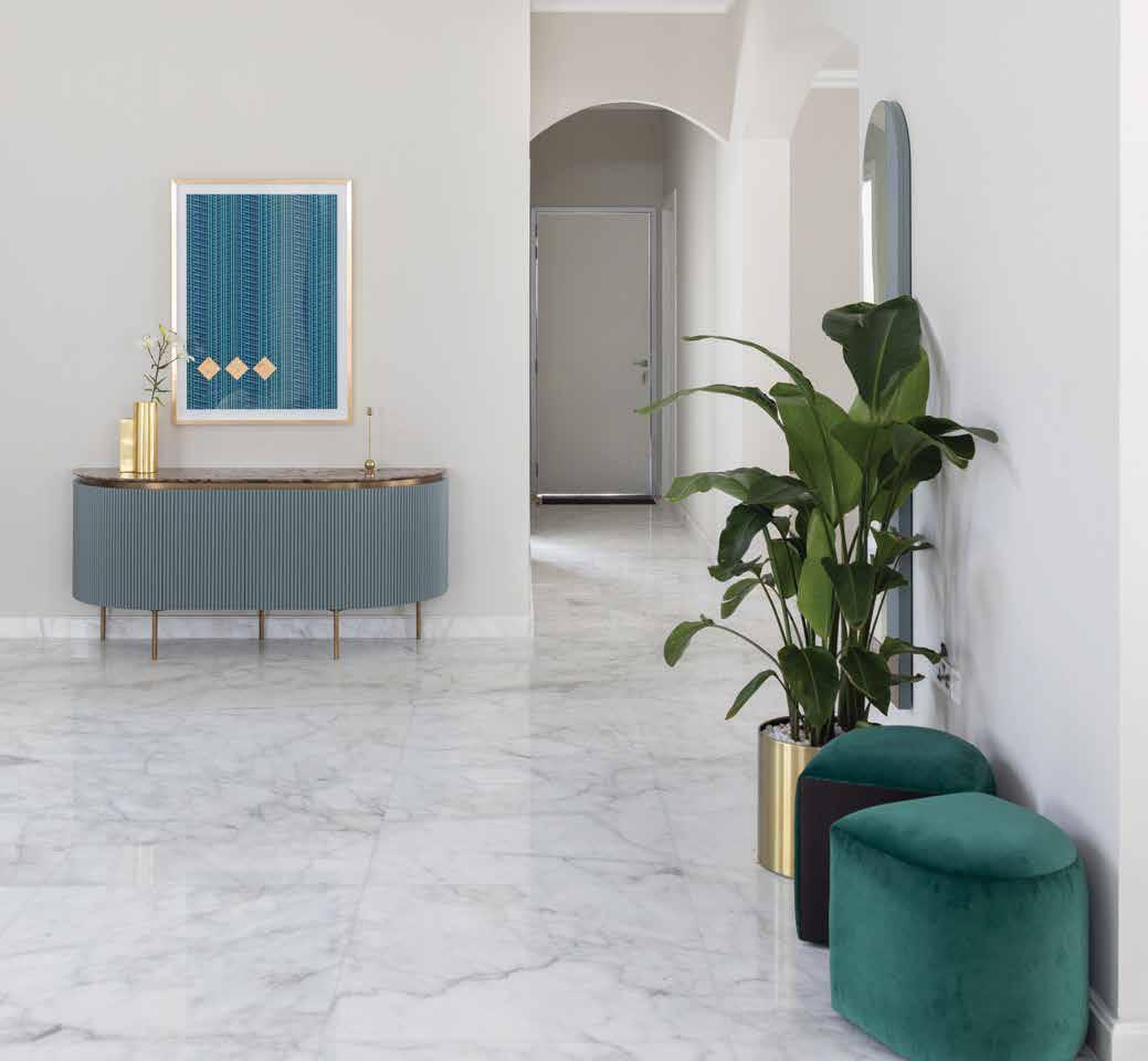 An extraordinary residence where design and craftsmanship are the hallmarks across every inch of the 30,000-squarefeet of space, stone and marble were fundamental to the overall design. “A showcase for the highest quality marble and stone, we worked with the design team from ADMYRA-Milan to ensure it was used in the best way possible. Each room, from the customised bathrooms and gourmet kitchen to the entertainment area, has a totally different marble concept with an eclectic mix of colours, combinations and materials,” explains homeowner and owner of GLAZE Granite & Marble, Nidhi Punia. This is extended to the flooring and cladding, which are also unique to each space.