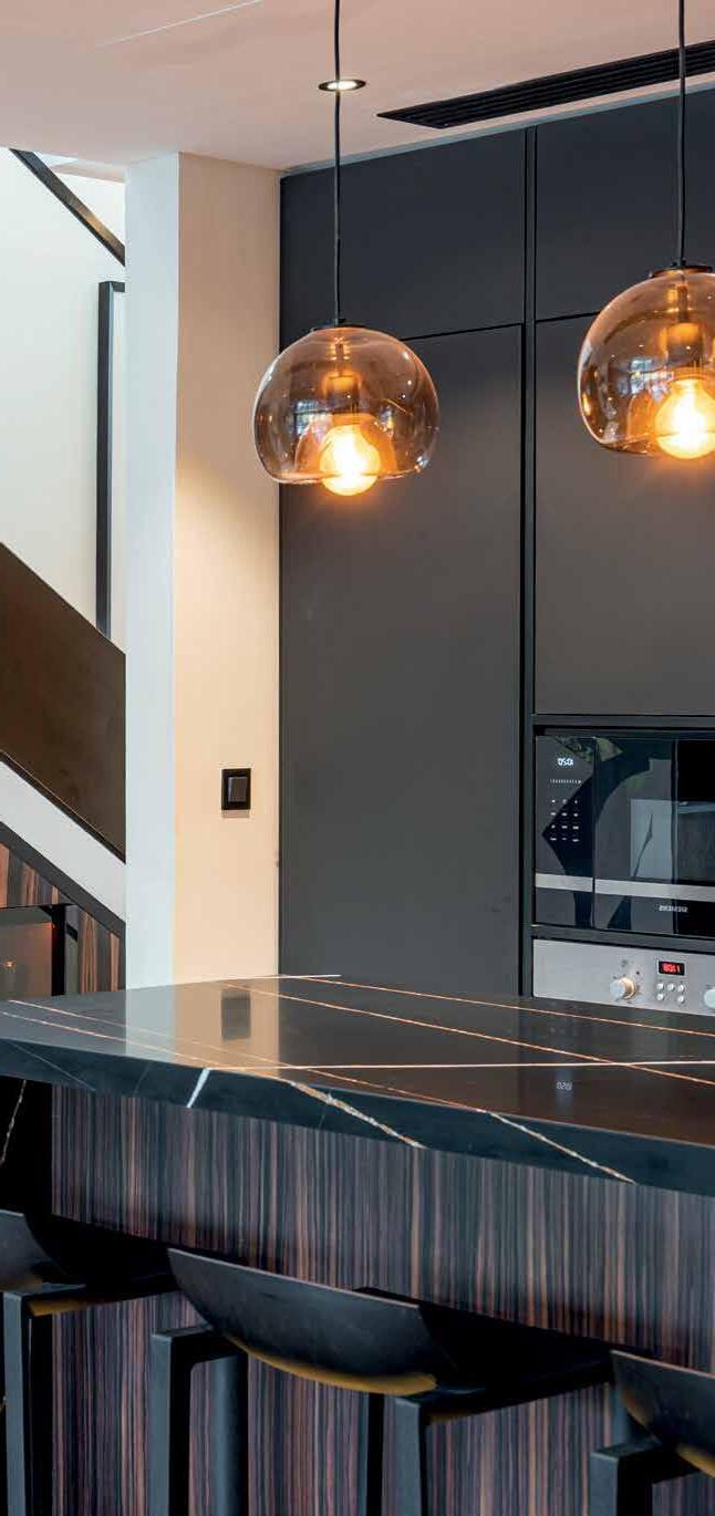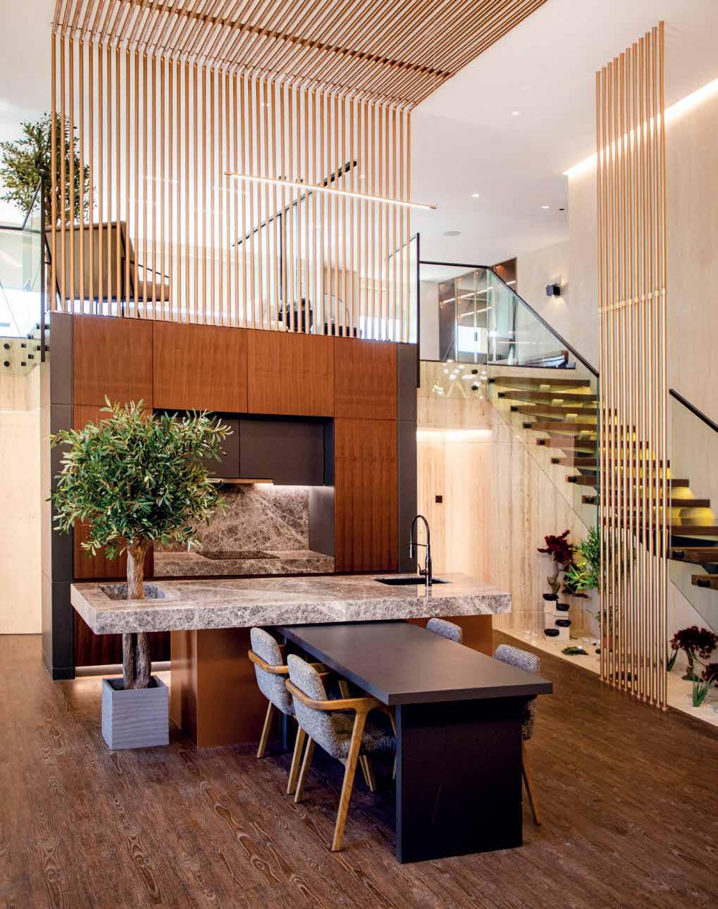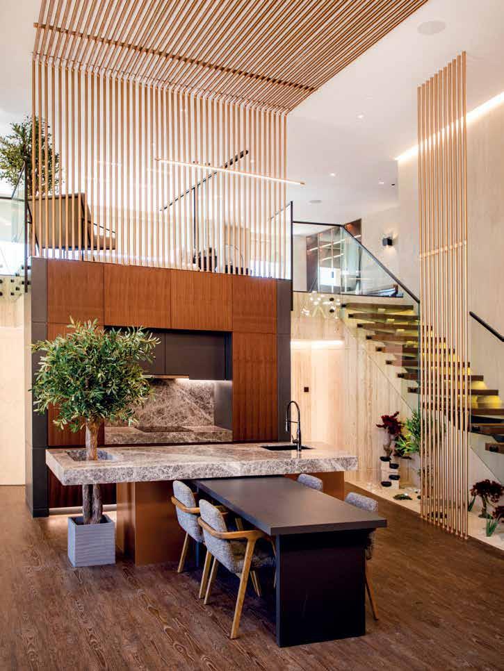 With a double-height living space as the hub of this almost 10,000-squarefoot home, the decision to focus on blending the existing architectural viewpoint with an expressively modern interior design direction was key. A unique and charismatic residence was the end goal for the design team at Dipiugi, with a full spectrum of features enmeshed with the bones of the building to add drama to an inherent sense of warmth. Wall cladding and other attentiongrabbing treatments were used to full effect to define individual areas while inviting you to discover their charm. The streamlined modern kitchen