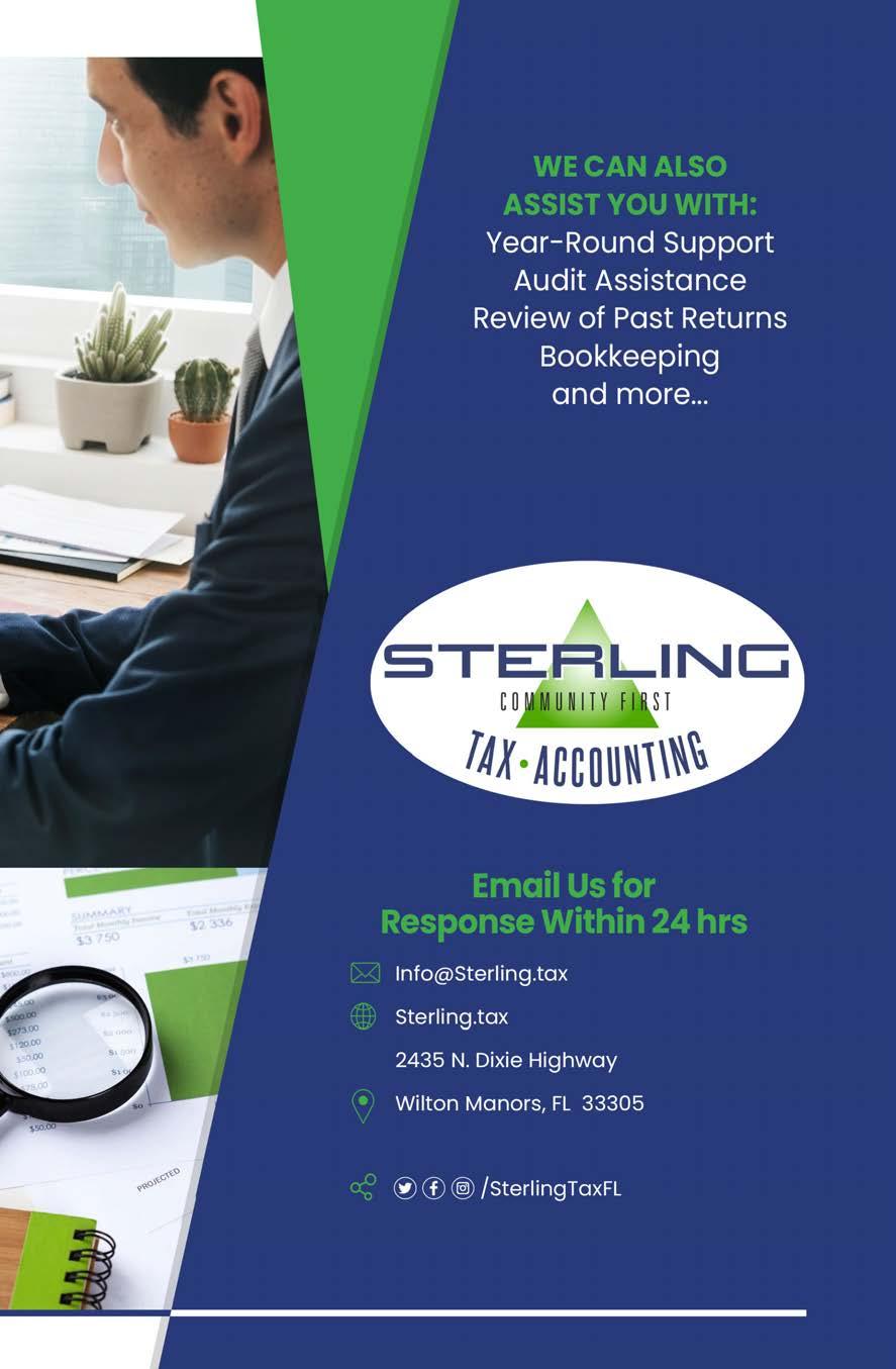 Friendly, engaging and specialized expertise for individuals and those with small businesses and real estate. Call Sterling Accounting at 954-667-9829. Tax@ SterlingAccounting.com