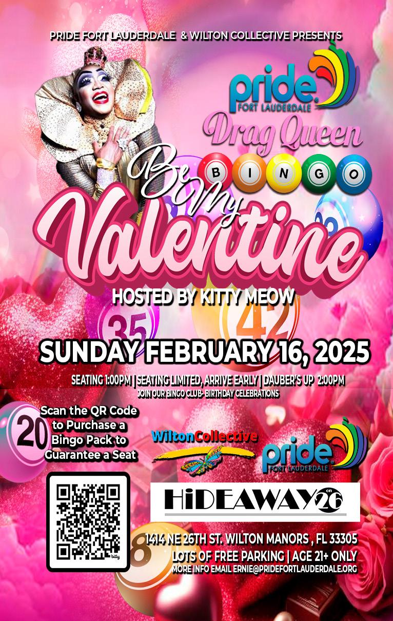 Pride Fort Lauderdale and Wilton Collective (1414 NE 26th St, Wilton Manors) present the return of Pride Drag Bingo with the theme “Be My Valentine,” and hosted by Kitty Meow. Seating starts at 1pm with daubers up at 2pm. From more info email Ernie@pridefortlauderdale.org, and to purchase tickets go to Pridefortlauderdale.org.