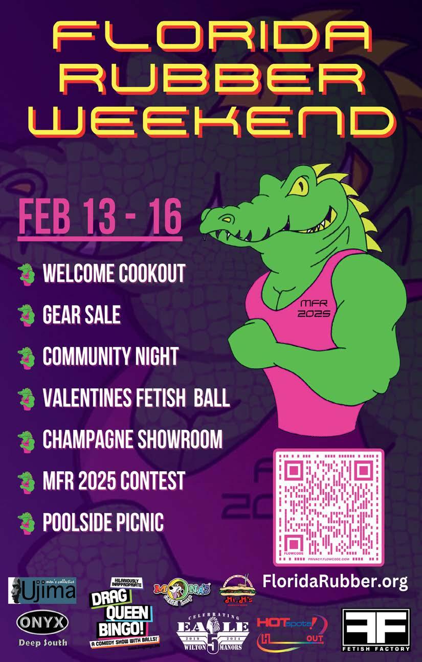 From today through Sunday, February 16th is the annual Florida Rubber weekend. The weekend features a welcome cookout, a gear sale, a community night, a Valentines Fetish Ball, a champagne showroom, MFR 2025 contest, and a poolside picnic. For more information, go to Floridarubber.org.