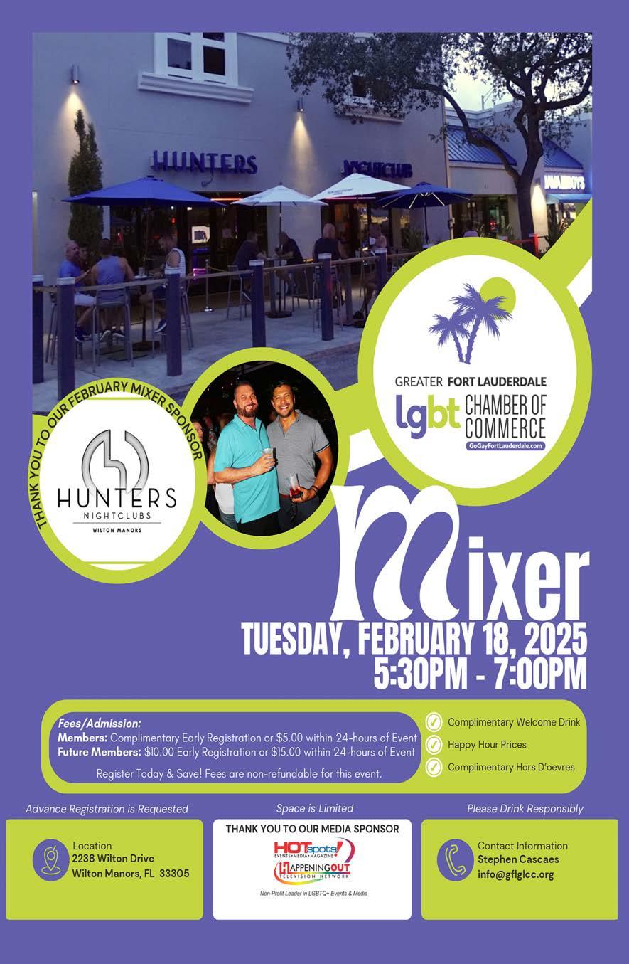 The Greater Fort Lauderdale LGBT Chamber of Commerce presents their February Mixer at Hunters from 5:30 to 7pm. The event will feature a complimentary welcome drink, complimentary hors d’oeuvres, Happy Hour prices and a great networking opportunity. Tickets are complimentary for members with early registration or $5 within 24 hours of event and $10 for future members with early registration and $15 within 24 hours of event. For more info, go to GGLGLCC.org.