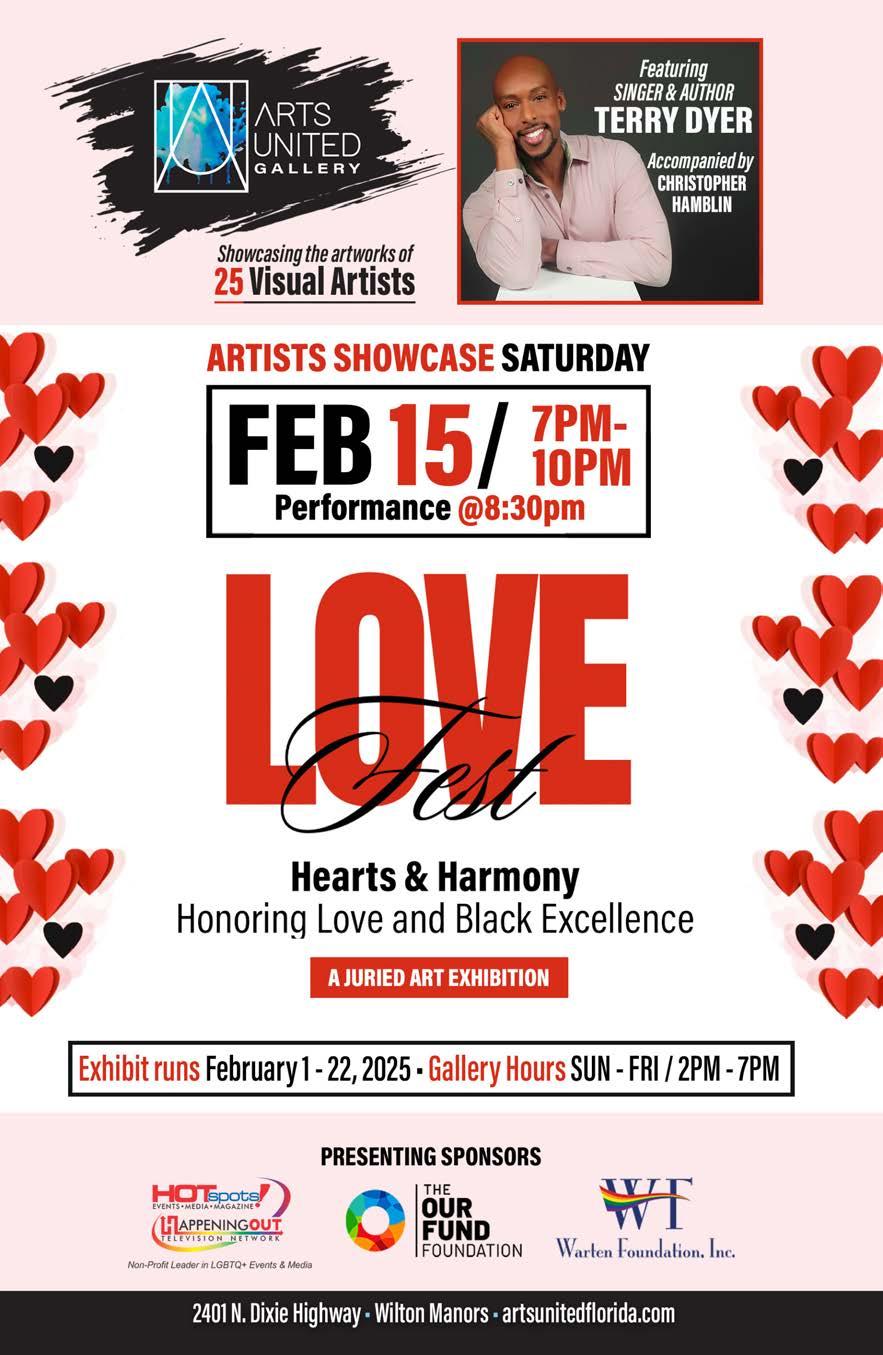 Arts United Gallery presents their February Artist Showcase (showcasing the artworks of 25 visual artists) entitled “LOVEFEST: Hearts and Harmony, Honoring Love and Black Excellence” from 7-10pm. The event will have a performance at 8:30pm with Terry Dyer singing accompanied by Christopher Hamblin. This will be a juried art exhibition and runs through Feb 22.