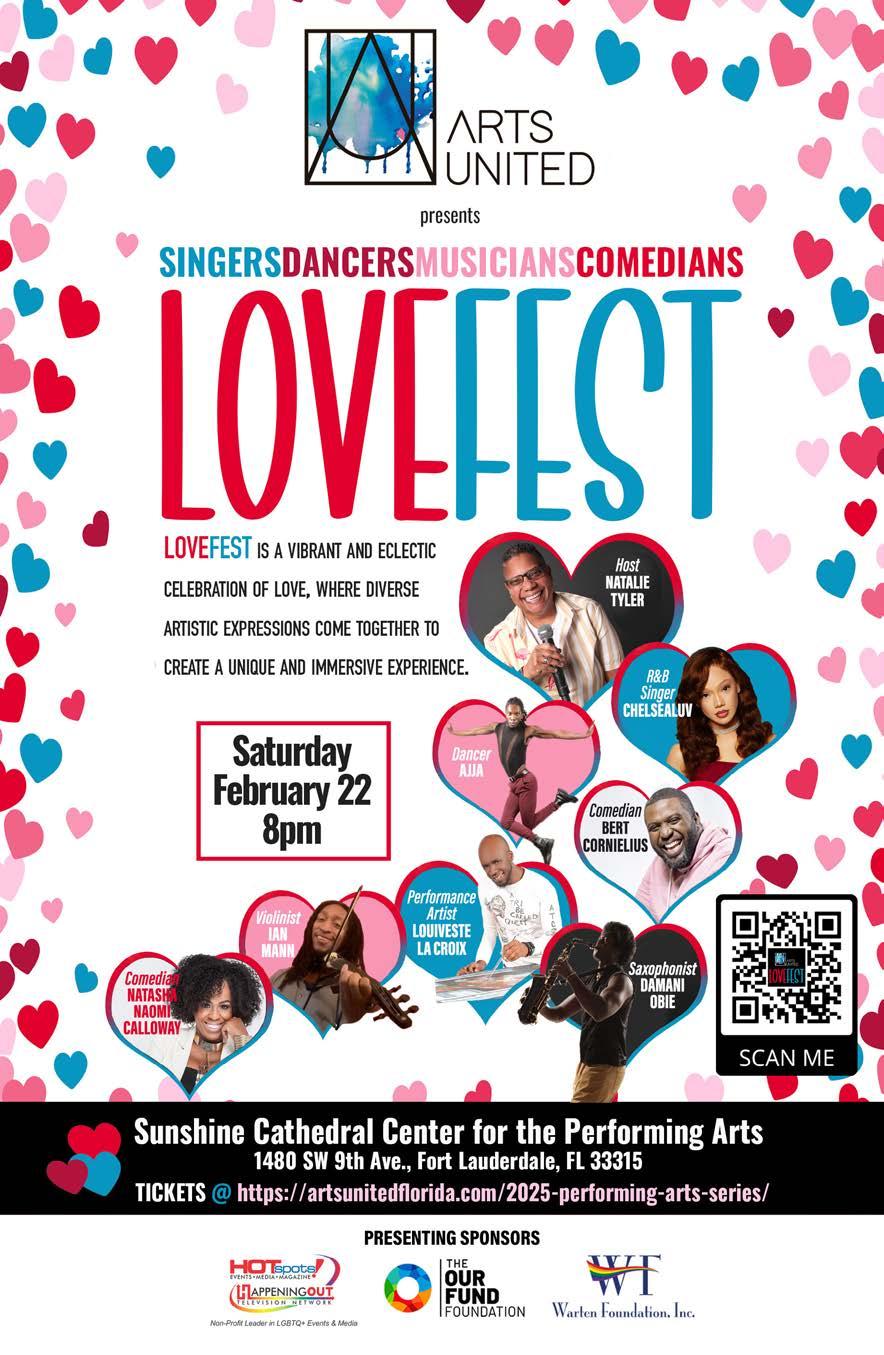 Arts United presents Lovefest (singers, dancers, musicians and comedians): a vibrant and eclectic celebration of love, where diverse artistic expressions come together to create a unique and immersive experience at 8pm at the Sunshine Cathedral Center for the Performing Arts. For more information or to purchase tickets go to Artsunitedflorida.com