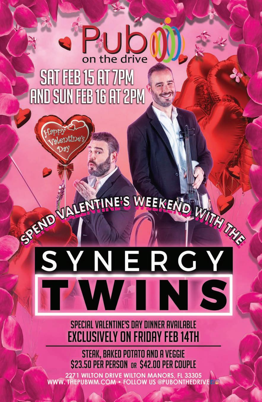 Pub on the Drive invites you to spend Valentines Day Weekend with the Synergy Twins: tonight at 7pm and tomorrow Sunday, Feb 16 at 2pm.