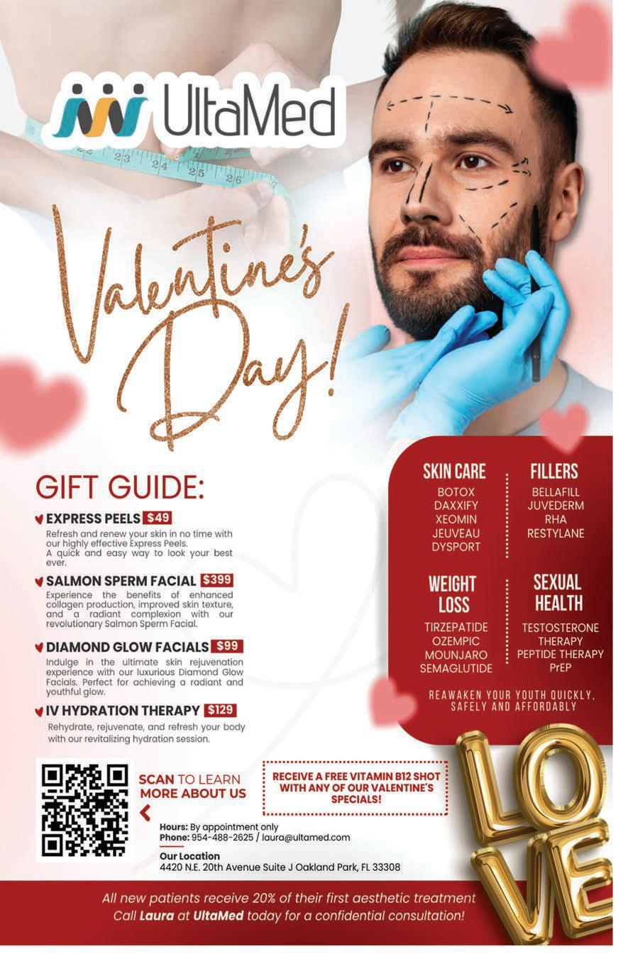 Ultamed (4420 NE 20th Avenue Suite J, Oakland Park) presents some valentines day specials where they will be featuring an Express peel for $49, a Salmon Sperm Facial for $399, a Diamond Glow Facial for $99 or a IV Hydration Therapy for $129. In addition, receive a free vitamin B12 shot with any of these specials. For more information or to book an appointment go to Ultamed.com