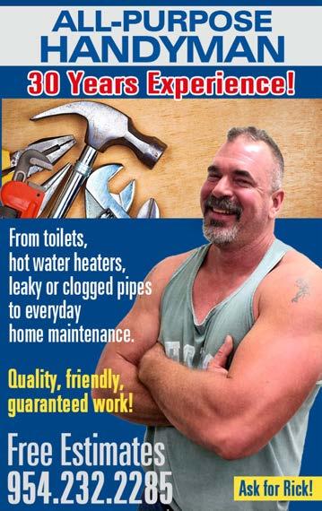 TV Wall mounting, Ceiling Fans, Bathroom, kitchen, faucet, microwave, plumbing and electric, outlets, switches, breakers. Time clocks, Upgrade breaker box, repair or replace sprinkler & pool motors, replace & remove hot water tanks & install tankless water heaters. Bathroom, Vanity, sinks, dishwasher & garbage disposals and SHOWER GRAB BARS. Replace Door knobs and locks (locksmith). K&J 954-260-9940 BEST PRICES IN TOWN! 32 Years Experience.