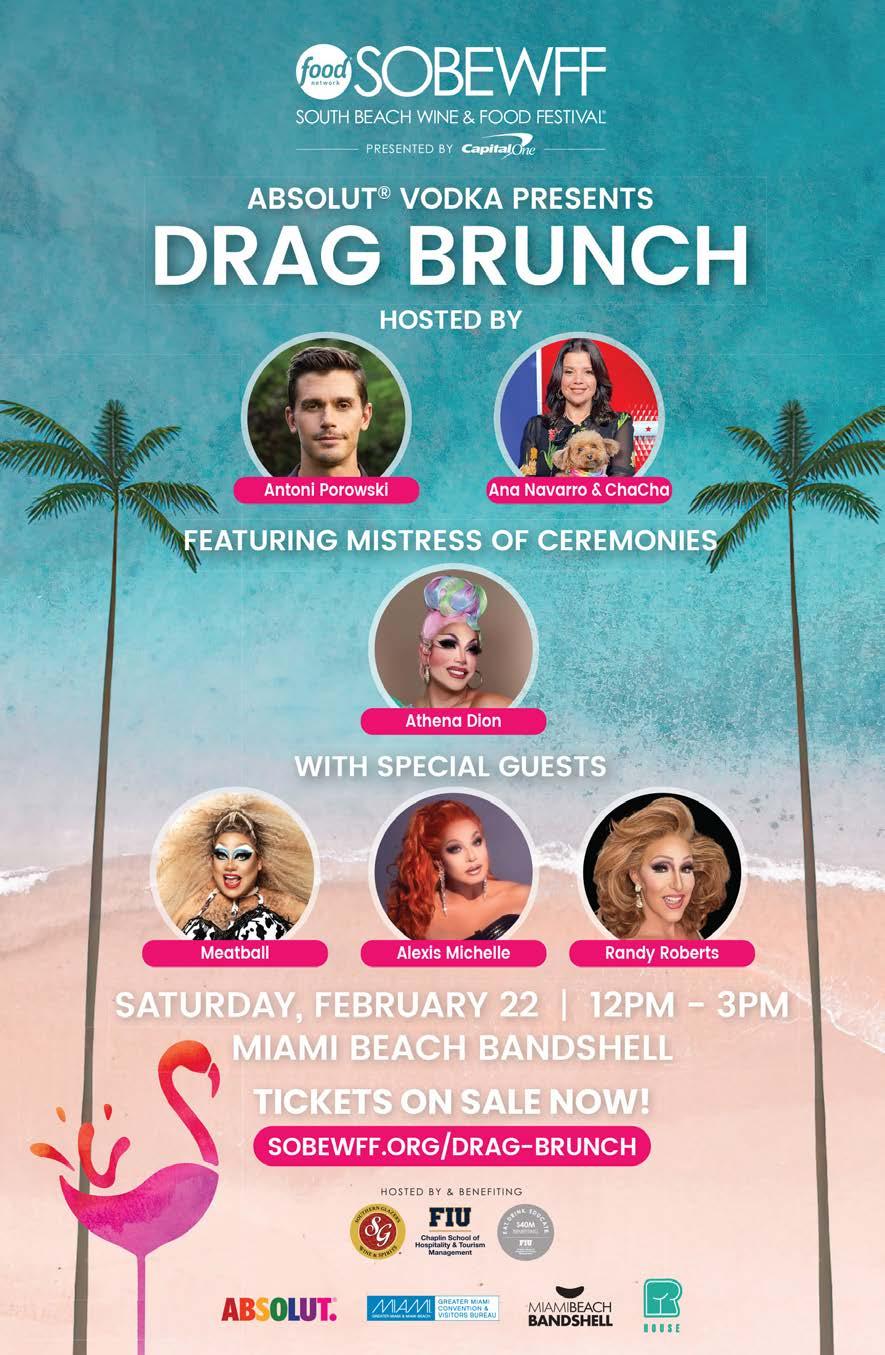 The South Beach Food and Wine festival’s annual Drag Brunch presented by Absolut Vodka is hosted by Antoni Porowski and Ana Navarro and her dog ChaCha is from 12 to 3pm at the Miami Beach Bandshell. Mistress of ceremonies is Athena Dion with special guests Meatball, Alexis Michelle of Ru Paul’s Drag race and Ru Paul’s Drag Race All Stars and Randy Roberts. Tickets on sale at Sobewff.org/drag-brunch.