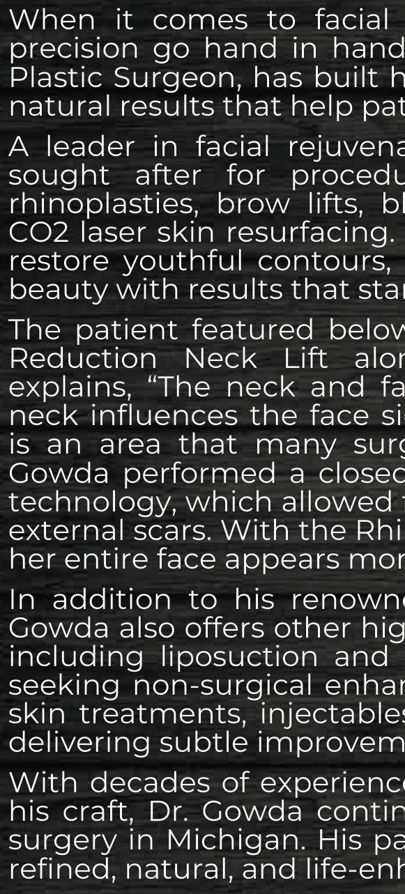Your health and beauty are in trusted hands when you choose Dr. Elan Reisin, M.D., F.A.C.S., at Star Plastic Surgery in Novi. A multiyear Hour Detroit Top Doc honoree, he’s board-certi ed in plastic and reconstructive surgery and has received numerous national awards. Dr. Reisin, who serves as medical director at Star, and his team have completed over 25,000 cosmetic procedures. Dr. Reisin spent ve years as an attending physician, teaching plastic surgery residents at the prestigious Georgetown University Hospital Department of Plastic Surgery, before creating Star Plastic Surgery, a pre-eminent, state-ofthe-art A.A.A.H.C. surgical center and medical spa. He’s a member of the International Society of Aesthetic Plastic Surgery and the American Society of Plasitc Surgeons. He has traveled internationally to learn from top plastic surgeons and partaken in philanthropic trips to treat children with congenital and traumatic deformities in the Dominican Republic.