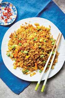 2. Add the chopped chillies and fry for a further 30 seconds until fragrant, then add the cooked rice and continue to fry for two to three minutes; you want the rice grains to toast slightly, which will give your dish a slightly nutty flavour, so don’t stir the ingredients constantly.