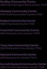• Tom Bass Community Center 15108 Cullen Blvd, Houston, TX 77047