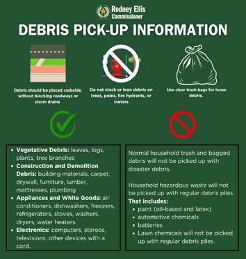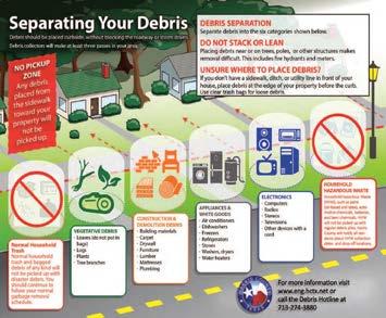 • Sort and Report Storm Debris: Place debris curbside and call 311 for pickup. Follow guidelines on the Ready Harris storm debris guide.