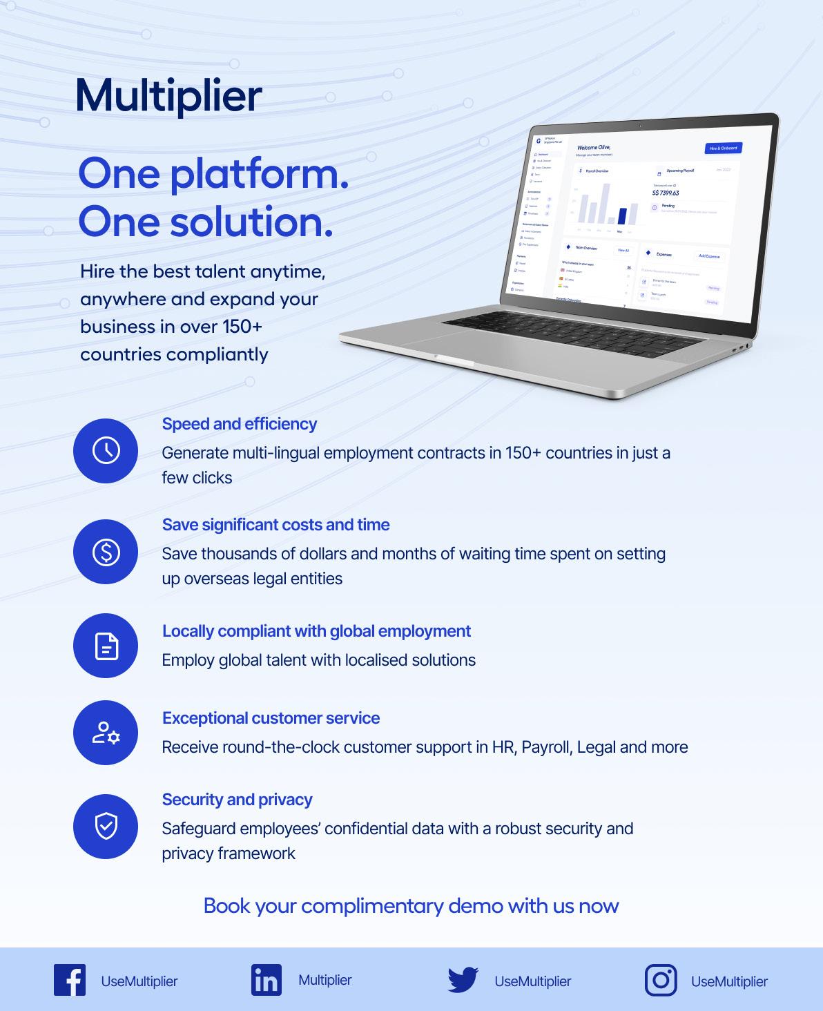 Specifically, employers can utilise the platform to manage international payroll for their global workforce in more than 120 currencies and bring them all down to a single monthly invoice. They may also offer competitive benefits and insurance, which the Multiplier team is constantly updating to comply with local laws and norms; and manage their workforce better by centralising documentation around employment, offer letters, payslips, insurance, expense receipts, time offs, and more.