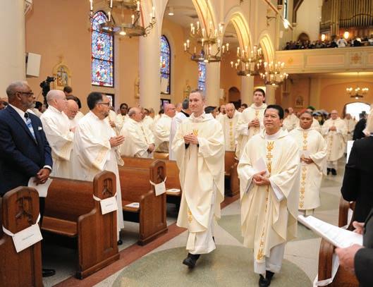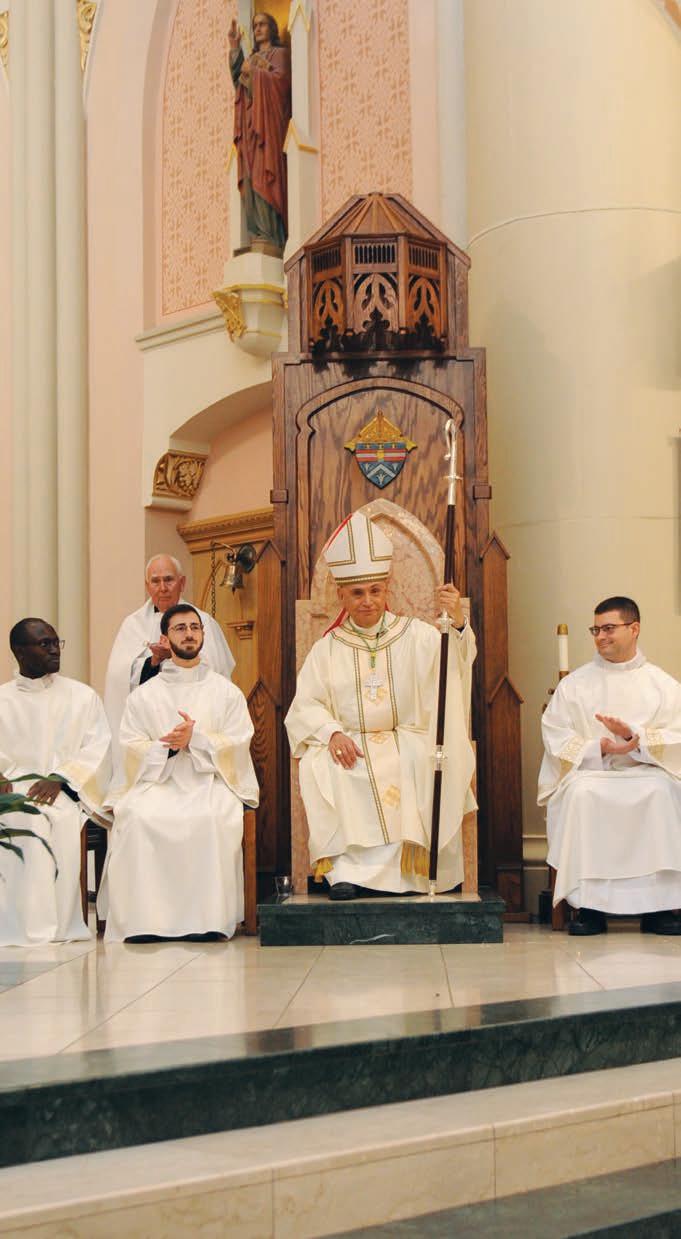 Dorsonville to the cathedra, the chair from which the bishop exercises his role as teacher of the church. The bishop’s chair is the most ancient symbol of episcopal ministry, signifying the oneness of the people of a diocese with their bishop. Archbishop Aymond presented the crozier to Bishop Dorsonville and he was seated in the cathedra to a roaring round of applause.
