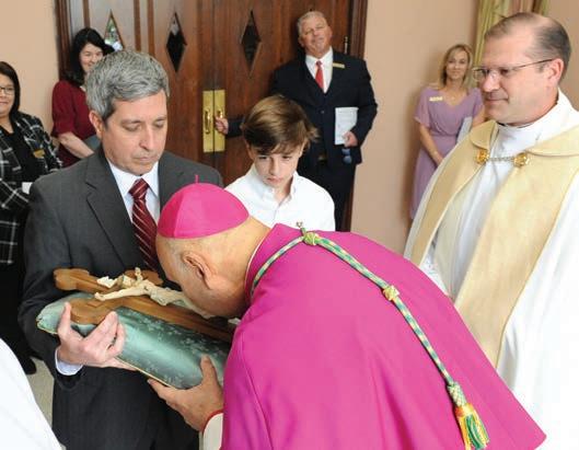 gift from his father when he was 15 years old. The bishop was greeted by Very Rev. Joshua Rodrigue, S.T.L., past rector, and the cathedral parish pastoral council. Very Rev. Rodrigue presented the bishop with a crucifix, which he kissed and then blessed the people gathered there. Afterwards, Bishop Dorsonville was escorted to the tabernacle to offer a brief prayer before the Mass of Installation.