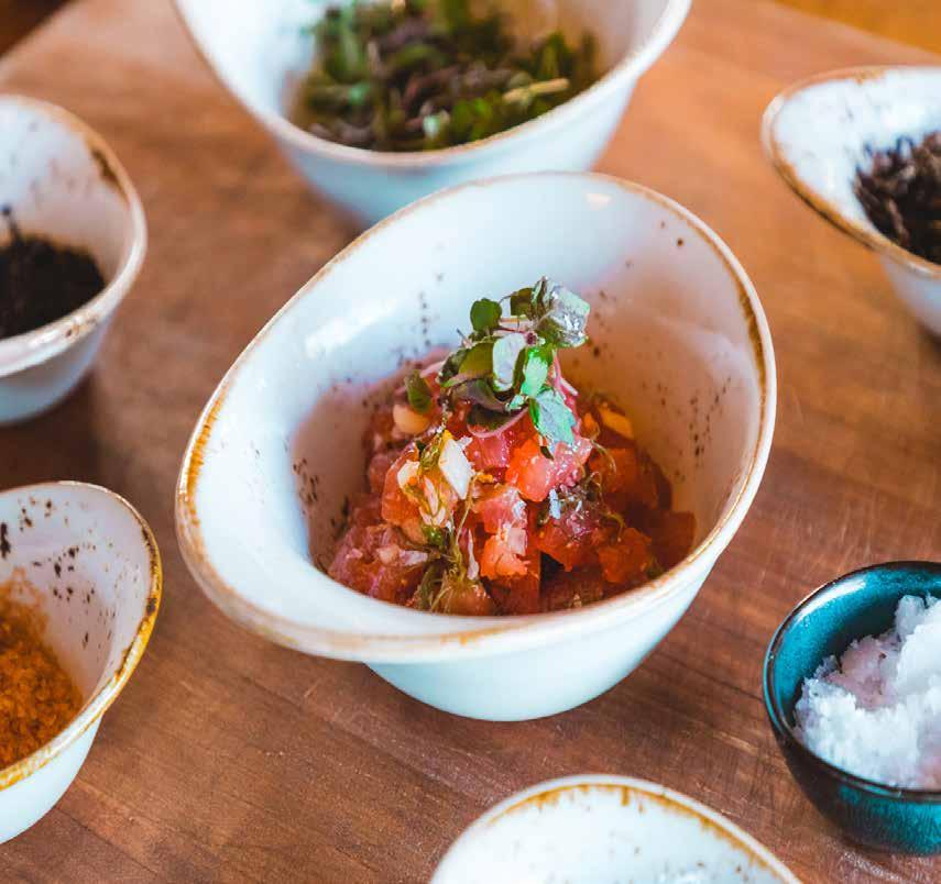 Omakase is to dine while entrusting your meal to the Chef. The omakase experience at ‘ULU is a multicoursed meal that is a contemporary and reflective experience on Hawai`i Island. Combining ingredients, both local and Japanese, with traditional preparations and a touch of the modern, courses will transition from an array of otsumami (small dishes) to sushi. Reservations required. Communal, up to 8 guests and offered Saturdays Only.