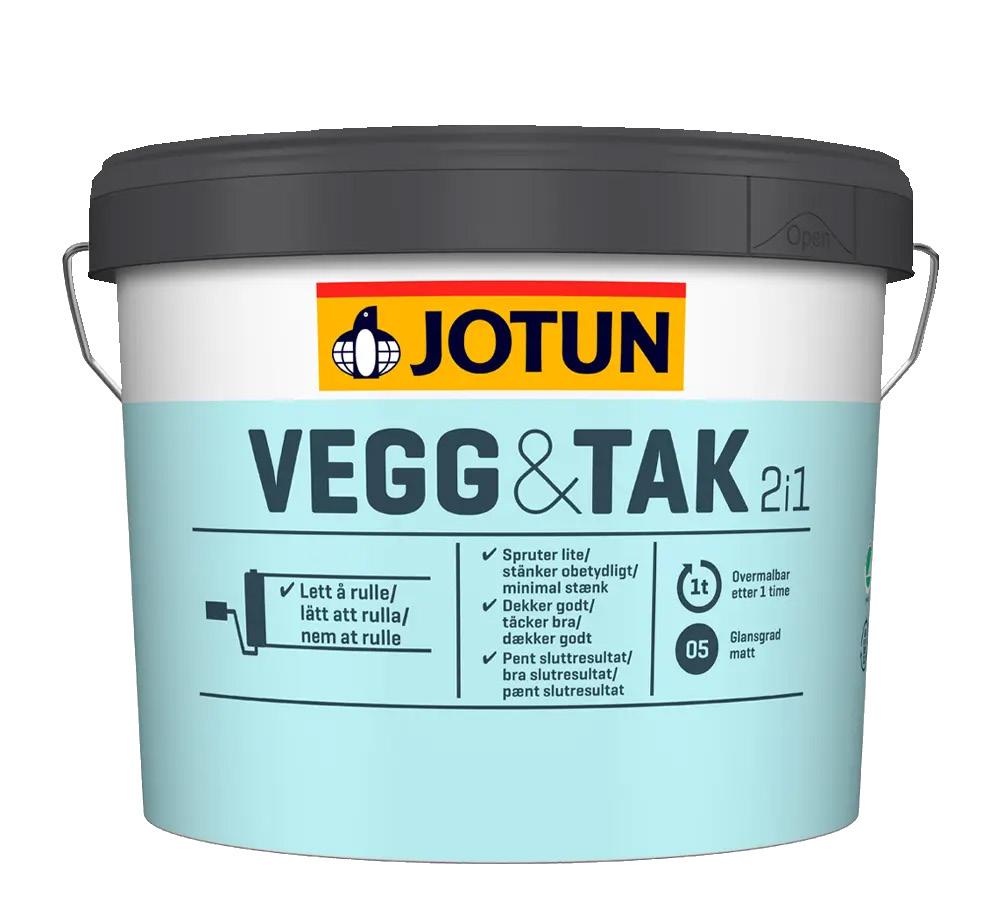 Tvær í einni dós (2in1), Veggog loftamálning. Málningin þornar hratt, þarf aðeins klst. á milli umferða. Gljástig 5 er nægur gljái fyrir veggi og passlega matt fyrir loftið. 7119784
