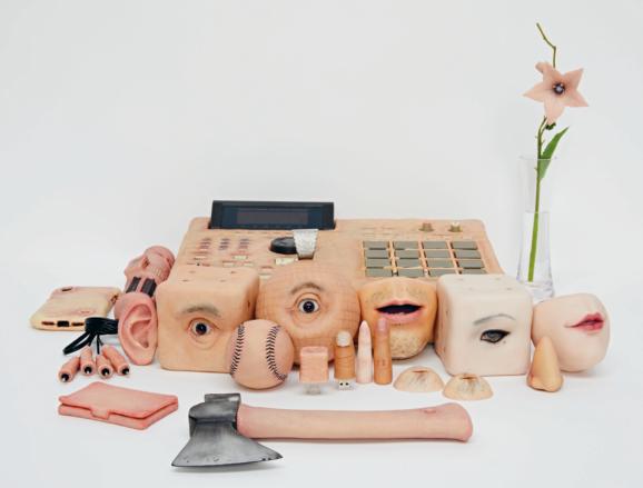 She leads me to what looks like a stack of cinder blocks, pulling on the top to reveal a system of cantilevered storage trays, like a fishing box or a fancy makeup case. That the piece draws comparisons to such distinctly coded objects speaks to the way her absurdist humor challenges binaries of gender as much as genre and form.