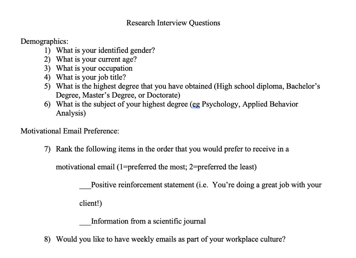 After providing demographic information, the participants completed a pretest and survey. The pretest utilized was the Abridged Job Descriptive Index, which is a valid and reliable measure (Guidroz, et al. 2010; Inoyatova, 2021) published by Bowling Green State University (2009). Additionally, a survey questionnaire was administered containing several measurement scales. The selected scales are attached as Appendix A (A bridged Job Descriptive Index), and Appendix B (Research Interview Questions). The Abridged Job Descriptive Index may be downloaded and used without special permissions and is frequently used by academic and organizational researchers to measure employee attitudes such as job satisfaction. The first six questions relate to demographics including the participants identified gender, current age, occupation, job title, highest degree obtained, subject area of highest degree. The seventh question asks the participant to rank their preference of content in a motivational email. The eighth question asks if the practitioner would like to have weekly emails as part of their workplace culture. Each motivational email sent during the study had two parts. The first part included positive reinforcement statements (i.e., You’re doing a great job providing ABA services to your client!) The second part of the email included information from a scientific journal on ABA best practices.