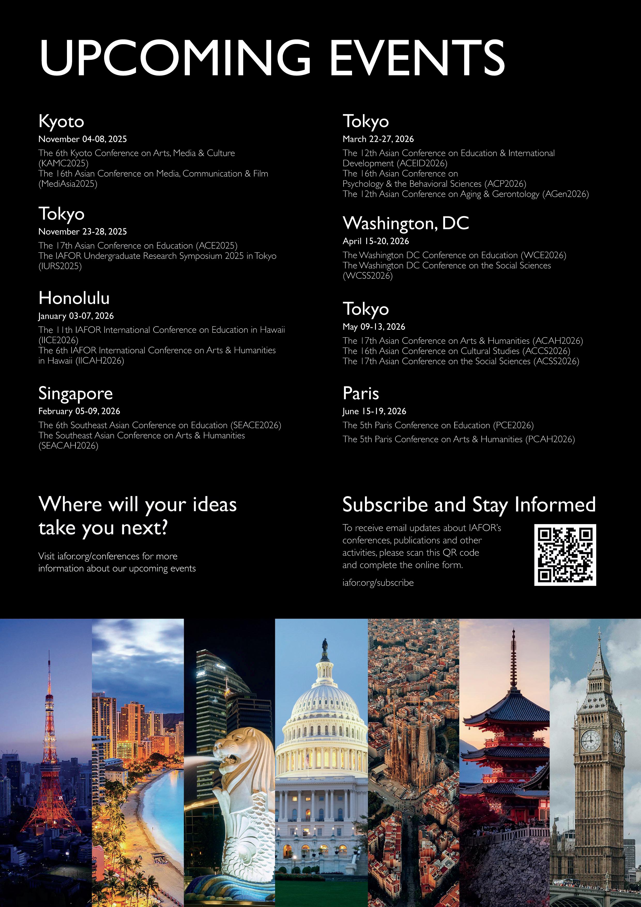 An IAFOR conference offers a great comparative and contrastive intellectual laboratory for delegates to both learn from and inform, and we are pleased to welcome some 300 delegates from more than 62 countries to participate and co-create this event. IAFOR delegates come from around the world, and yet they are united through a common understanding that engagement across the lines of nation, culture, and discipline is central to not only their individual personal and professional lives, but also more widely to that of humanity. The problems we face individually and societally cannot be addressed alone, and requires cooperation within and outside our given communities.
