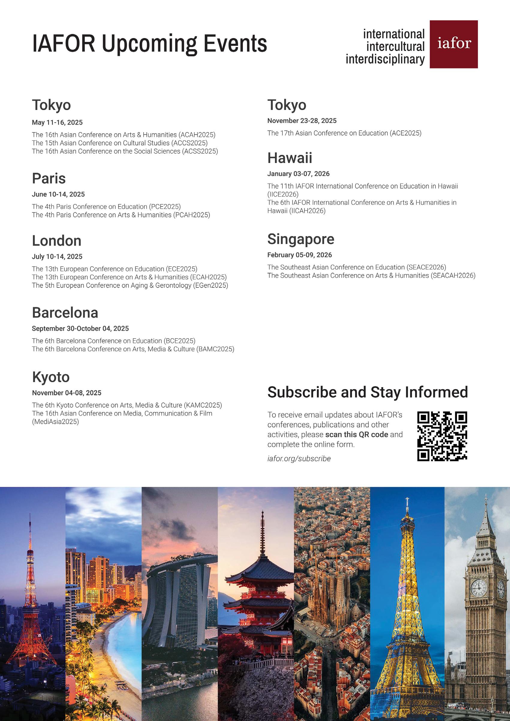 This session provides an overview of what to expect at the conference, including guidance on preparing your presentation, publishing opportunities, and ways to engage with IAFOR. You will receive practical tips on setting up your presentation, understanding your role at the conference, including how to attract a larger audience to your session. We will also outline the publishing opportunities available, including how to submit your work to be included in the Conference Proceedings or IAFOR Journals. This session also offers a chance to explore the opportunities for deeper engagement, whether through networking with fellow delegates or getting involved more with IAFOR. Join us, and get ready to present, publish, and participate.
