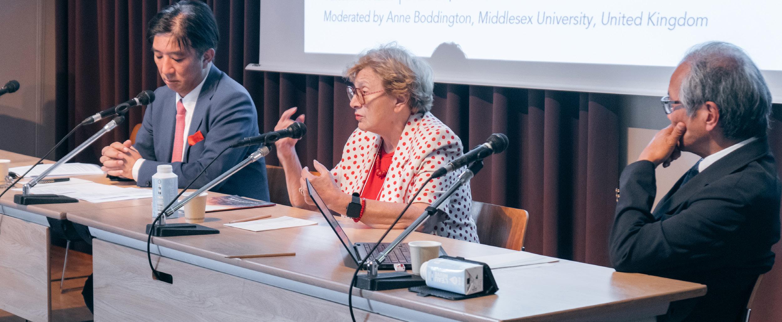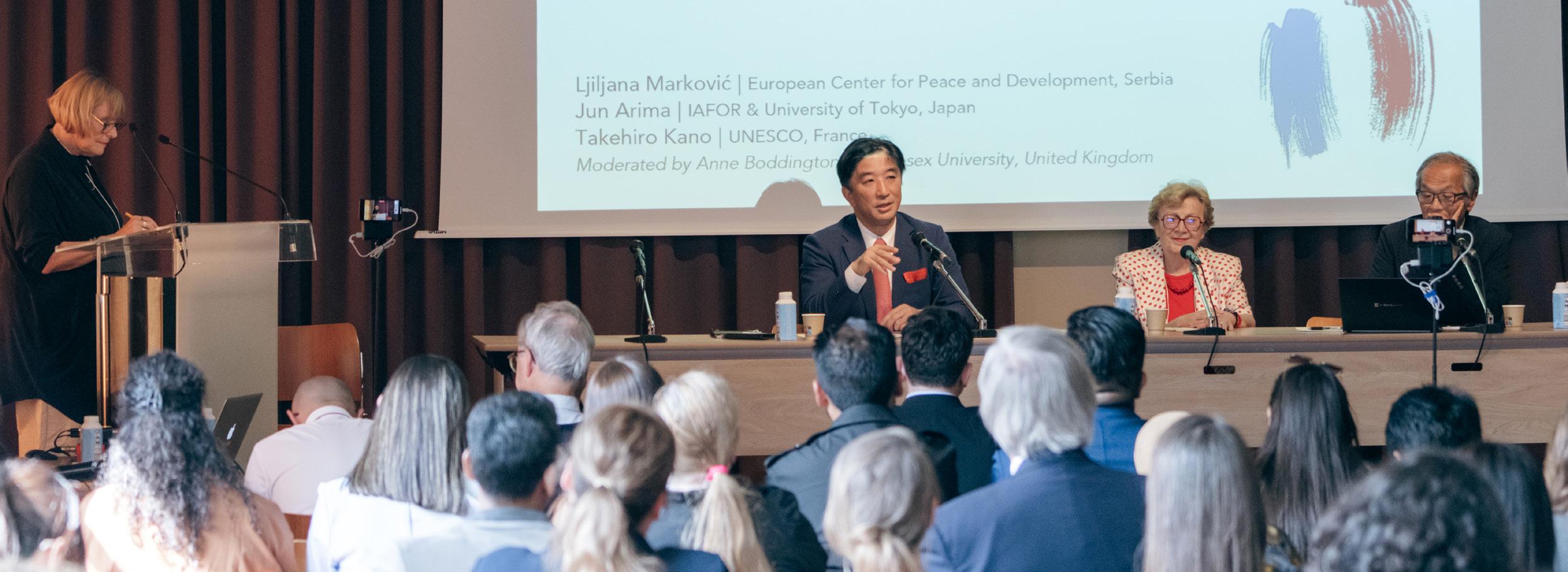 The panel on International and Interdisciplinary Perspectives on Global Citizenship in Times of Change and Crisis, moderated by Professor Anne Boddington, focused on how international institutions attempt to harness the insights of these different stakeholders to enact positive change where institutions fail to operate effectively and ethically. Three panellists who are engaged in three different international institutions shared their insights on how international institutions work and how their role will change: Ambassador Takehiro Kano, the current Japanese Ambassador to UNESCO in Paris; Professor Ljiljana Marković, a professor and academic director at the United Nations University for Peace’s European Center for Peace and Development (ECPD), Serbia; and Professor Jun Arima from the University of Tokyo, Japan, a chief negotiator at the COP, the UN’s Convention on Climate Change. The three panellists discussed how their respective institutions go about cultural heritage, education, and climate change, each highlighting the need for a different kind of multilateral cooperation to achieve all those aspirational goals for a better future.