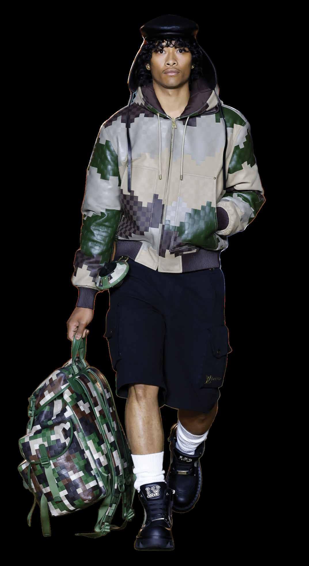Standout pieces include the redesigned varsity jacket embellished with rhinestones and a Louis Vuitton script logo. The fusion of camouflage and the ICONIC Damier pattern creates a new print, “Damoflage,” adorning denim, knits, fur and tailoring. Each garment exudes a sense of individuality, staying true to Pharrell’s distinctive identity while remaining timeless and elegant.