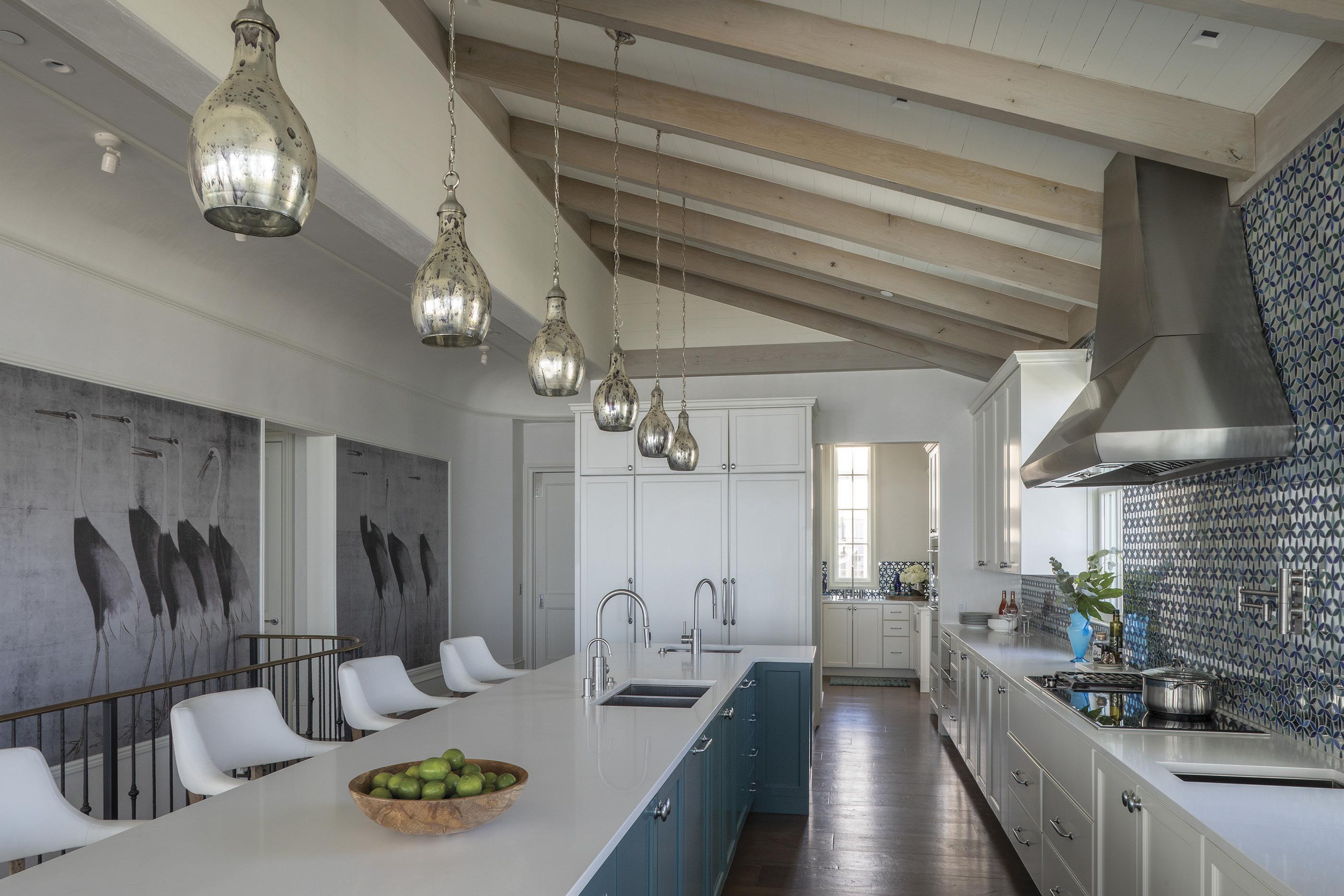 Head up the gorgeous staircase wrapped in Venetian plaster and enter a huge living/dining space that opens onto the elevated pool deck! Open up the “eatery” windows to serve “happy hour” any hour to the attached pool bar. The kitchen has a scullery and marble waterfall island. The third floor has an entire master suite wing, including a glamorous bedroom, study, bathroom, and luxurious walk-in closet. Unload easily from the four-car garage onto the elevator to the third floor. The gated neighborhood features private beach access less than a minute’s walk away. Beautiful interiors by Melanie Turner!