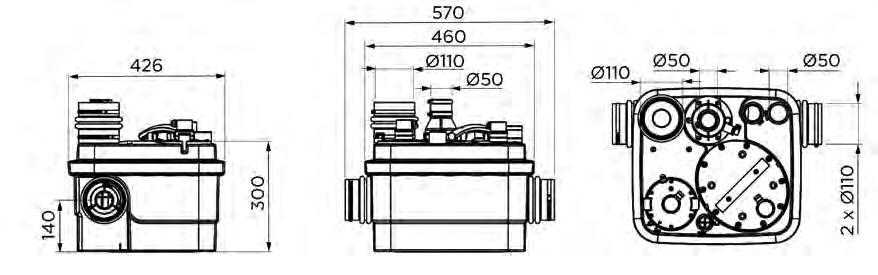 H (m) Flow rate (m³/h) External inlet diameter 40/50/100/110/125 mm External discharge diameter: 50 mm External ventilation diameter: 75 mm Sanifos 110 Number of pumps 1 Material Tank PE Pipework PVC Electrical features Sanipump GR S Voltage (V) 230 Frequency (Hz) 50-60 Power consumption P1 (W) 1500 Power output P2 (W) 1050 RPM (revolution per minute) () 2800 Electrical class I Motor insulation class F Mode of operation S3 30% Immersion depth (m) 5 Power cable: Length (m) 10 Power cable: Type of cable, section (mm²) H07 RN-F 3G, 1.5 Hydraulics Total head (m) 14 Max. flow rate (m³/h) 11 External inlet diameter (mm) 40/50/100/110/125 External discharge diameter (mm) 50 External ventilation diameter (mm) 75 Total volume (L) 110 Useable volume (L) 38 ON level /OFF level (mm) 320/120 Min. incoming water connection (mm) 182 Type of impeller Pro X K2 grinder Type of activation float Identification and logistics Gross weight (kg) 40 Barcode 3308815079318 Product code 40000 Dimensions (mm)