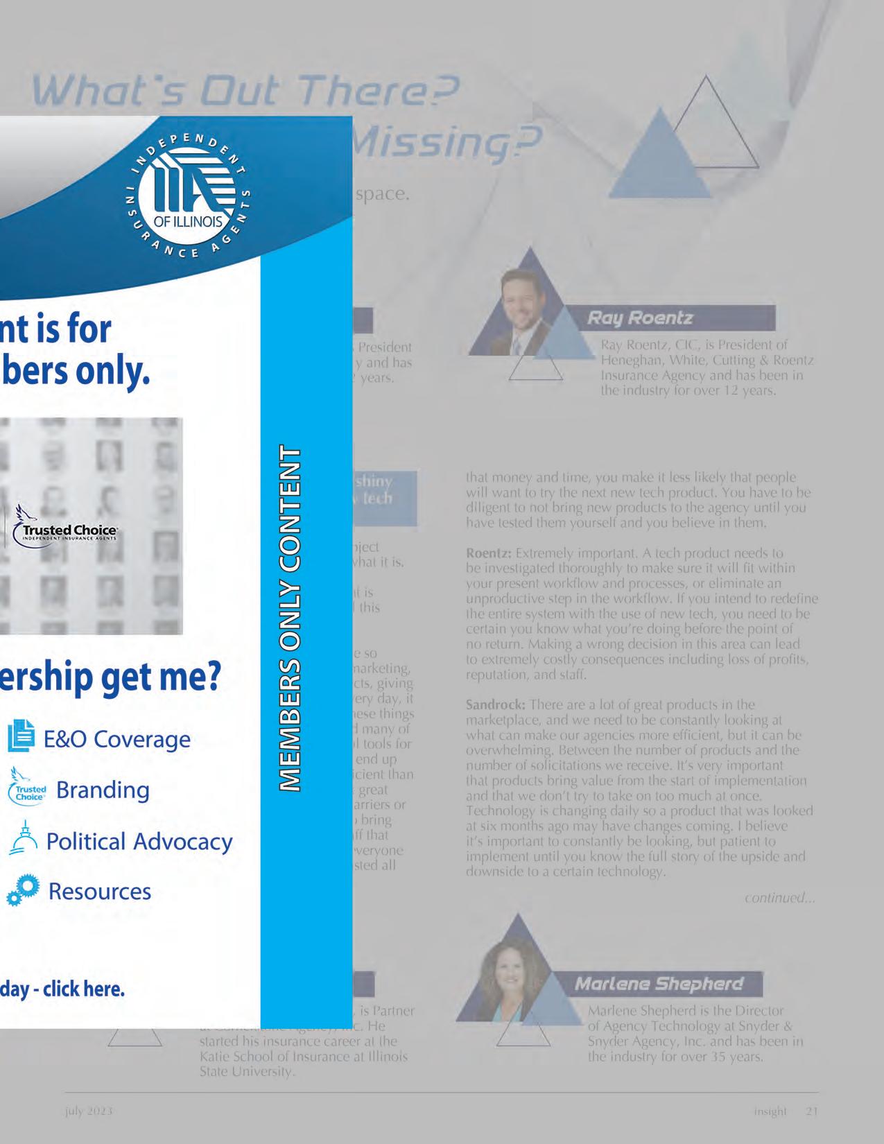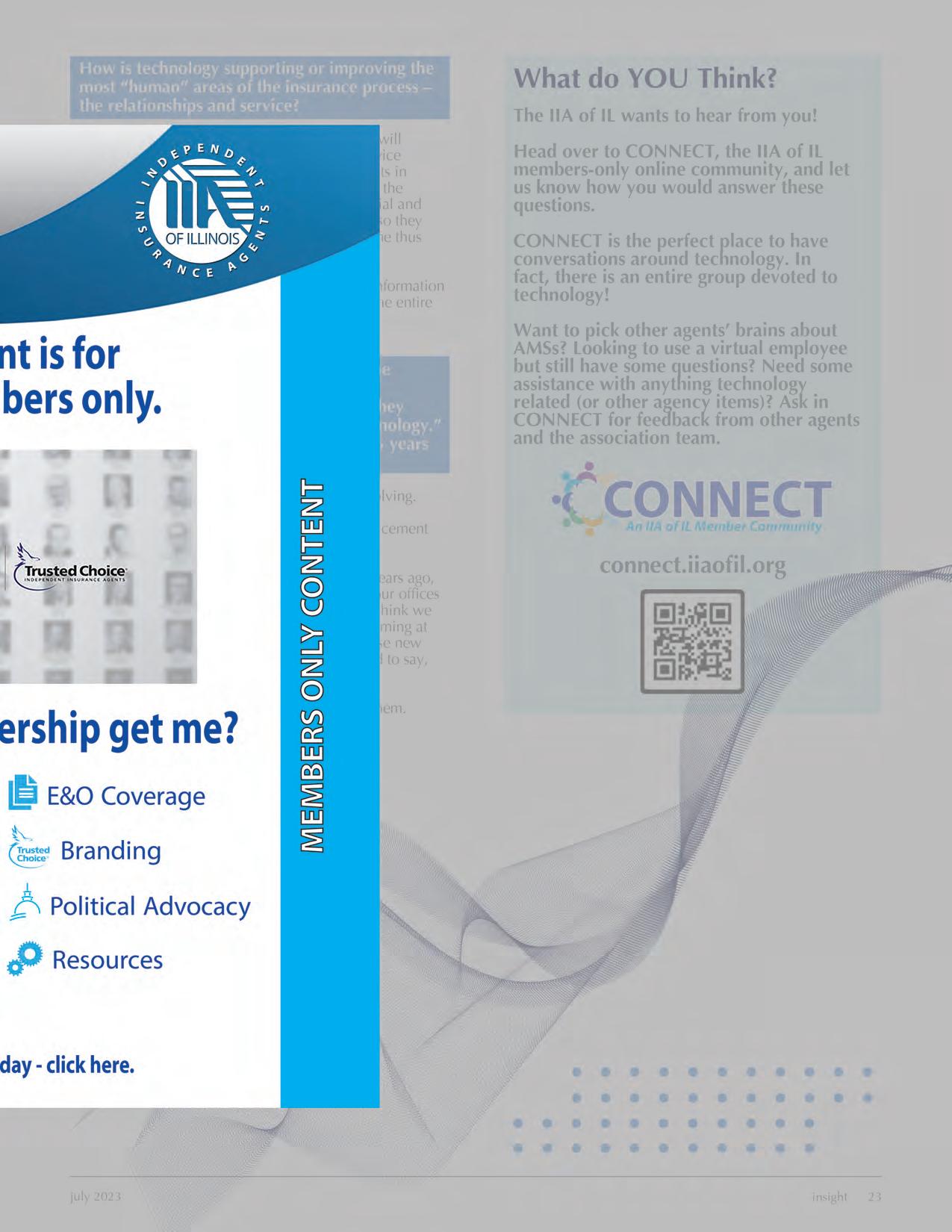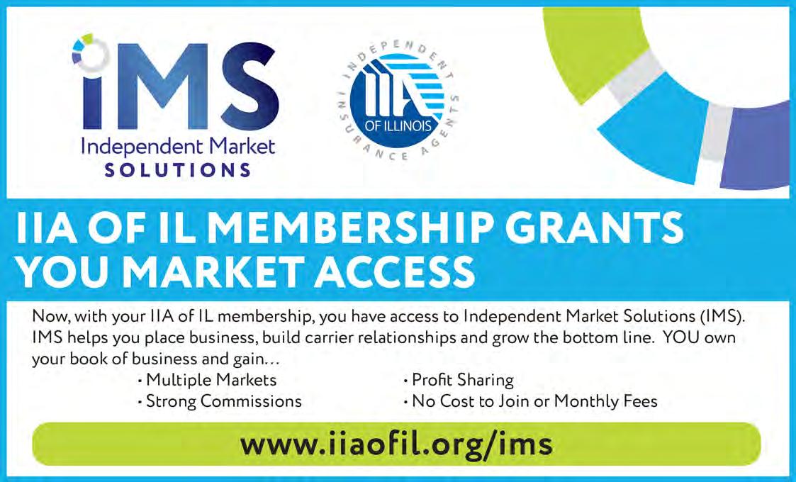 InsurTech Voices: What’s Out There? What are we Missing? Technology Committee Member Survey Results By Shannon Churchill CONVO 2023 FAC Summer Meeting Wrap-Up By Shannon Churchill 13 15 17 20 24 28 30 The Independent Insurance Agents of Illinois (IIA of IL) has been providing members with a sustainable competitive advantage since 1899. Insight is the official publication of the Independent Insurance Agents of Illinois (IIA of IL). The magazine is published monthly for the members of the IIA of IL, with the office located at 4360 Wabash Avenue, Springfield, Illinois 62711-7009; Consumer Website: www.ChooseIndependent.com. The IIA of IL welcomes letters discussing concerns of the insurance industry, articles, editorials, other matters of interest to the membership. The editor reserves the right to edit and select submissions for publication. Address submissions for review to Rachel Romines at rromines@iiaofil.org. For advertising information, contact Tami Hubbell at thubbell@iiaofil.org. In This Issue President’s Message Brett’s 5 Sense Trusted Choice e-Insight 9 10 12 19 info@iiaofil.org | www.iiaofil.org | (217) 793-6660 Editor & Graphic Design - Rachel Romines | Advertising - Tami Hubbell Associate News Agency Members in the news Association Update IIA of IL News Classifieds 32 36 36 37 38 July 2023 2009 • 2010 • 2011 • 2012 • 2013 • 2014 2015 • 2016 • 2017 • 2019 • 2020 • 2021 • 2022 13 10 24 17