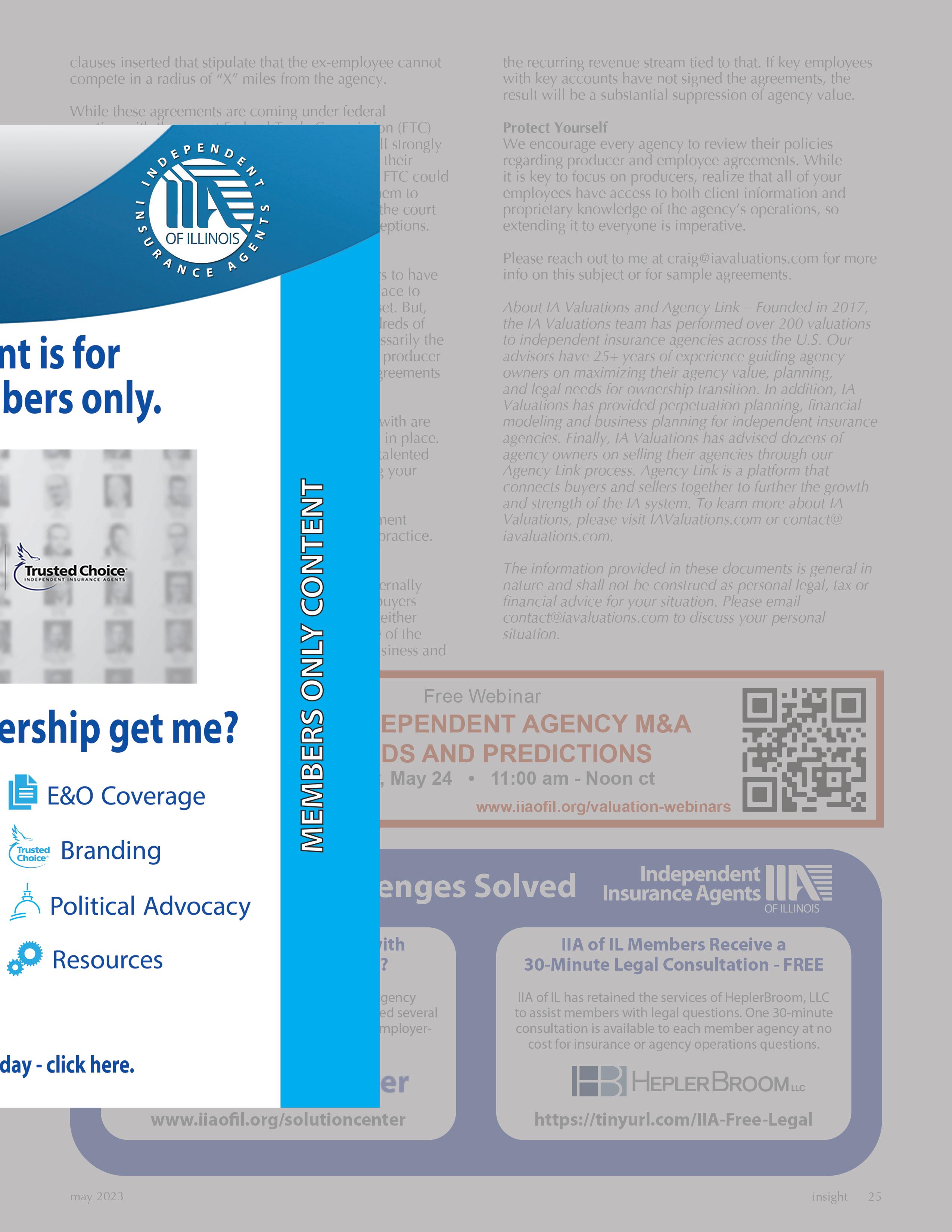 CONTENTS Personal Insurance Innovation Amid Industry Challenges - Is it Possible? By Michelle Jackson Why Renewals are the Worst Time for Account Rounding By Colby Tunick Everything You Need to Know About Starting an Insurance Referral Program By Irene Lopez Independent Insurance Agents and Carriers: A Relationship Ripe with Opportunity By Vertafore More than 30% of Insurance Agencies Lack Employment Agreements By Craig Niess The Gen Z Perspective By Olivia Scales 2023 EDGE Conference - Wrap-Up By Rachel Romines 12 15 18 23 24 26 28 The Independent Insurance Agents of Illinois (IIA of IL) has been providing members with a sustainable competitive advantage since 1899. Insight is the official publication of the Independent Insurance Agents of Illinois (IIA of IL). The magazine is published monthly for the members of the IIA of IL, with the office located at 4360 Wabash Avenue, Springfield, Illinois 62711-7009; Consumer Website: www.ChooseIndependent.com. The IIA of IL welcomes letters discussing concerns of the insurance industry, articles, editorials, other matters of interest to the membership. The editor reserves the right to edit and select submissions for publication. Address submissions for review to Rachel Romines at rromines@iiaofil.org. For advertising information, contact Tami Hubbell at thubbell@iiaofil.org. In This Issue President’s Message Brett’s 5 Sense Trusted Choice Industry e-Insight 7 8 10 11 17 info@iiaofil.org | www.iiaofil.org | (800) 628-6436 or (217) 793-6660 | Fax: (217) 793-6744 Editor & Graphic Design - Rachel Romines | Advertising - Tami Hubbell Associate News Association Update IIA of IL News Classifieds 31 32 33 34 May 2023 2009 • 2010 • 2011 • 2012 • 2013 • 2014 2015 • 2016 • 2017 • 2019 • 2020 • 2021 • 2022 15 12 26 23 GEN Z