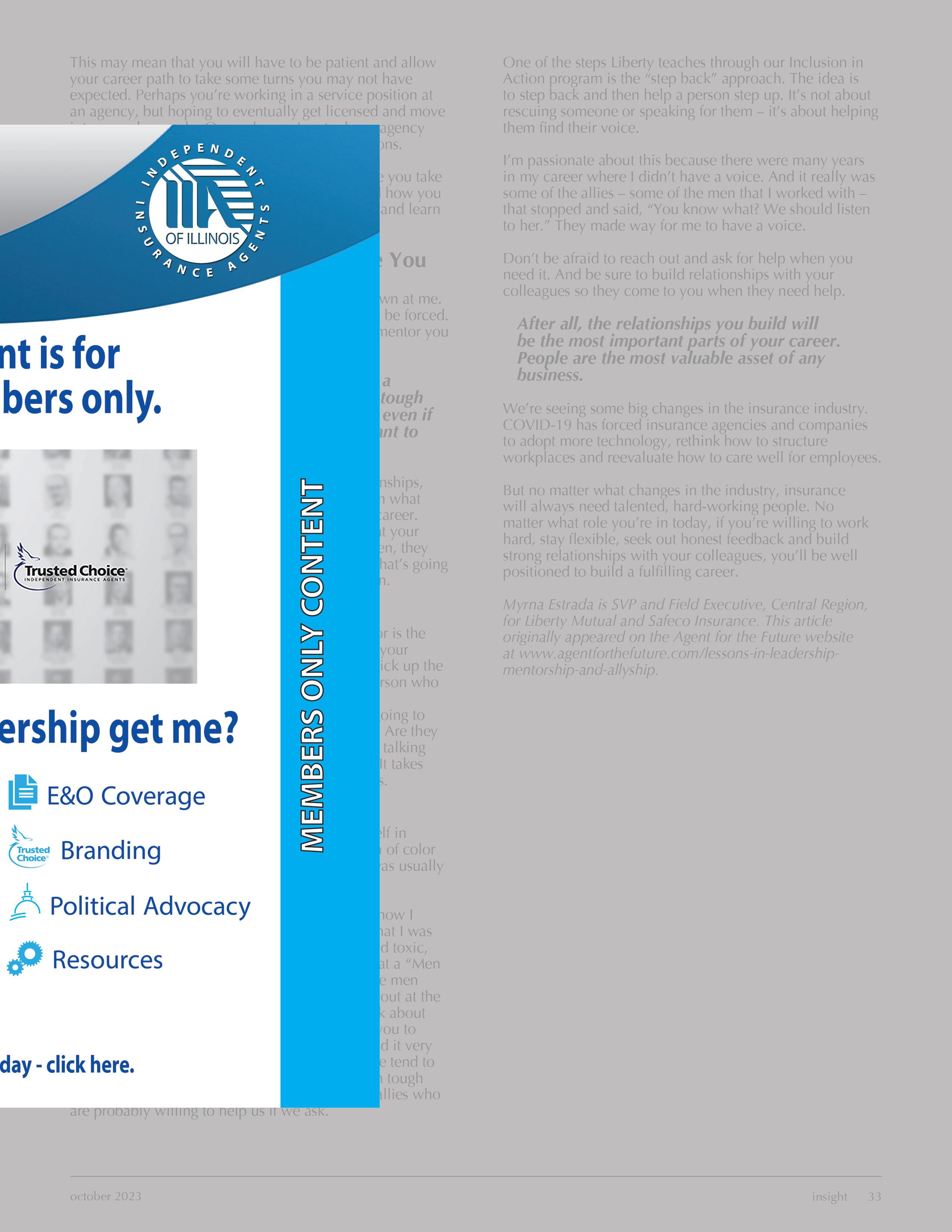 CONTENTS Labor Market Overview: Part One By Susan Pale 2023-2024 IIA of IL Board of Directors Trusted Choice Hard Market Toolkit Allyson Padilla - 2023-2024 IIA of IL President Four leadership Principles Vital to Your Insurance Agency’s Growth By Brent Kelly Lessons in Leadership, Mentorship and Allyship from 40 Years in the Insurance Industry By Myrna Estrada Mentoring New Producers 9 12 20 22 28 32 34 The Independent Insurance Agents of Illinois (IIA of IL) has been providing members with a sustainable competitive advantage since 1899. Insight is the official publication of the Independent Insurance Agents of Illinois (IIA of IL). The magazine is published monthly for the members of the IIA of IL, with the office located at 4360 Wabash Avenue, Springfield, Illinois 62711-7009; Consumer Website: www.ChooseIndependent.com. The IIA of IL welcomes letters discussing concerns of the insurance industry, articles, editorials, other matters of interest to the membership. The editor reserves the right to edit and select submissions for publication. Address submissions for review to Rachel Romines at rromines@iiaofil.org. For advertising information, contact Tami Hubbell at thubbell@iiaofil.org. In This Issue Brett’s 5 Sense e-Insight Associate News 7 17 36 info@iiaofil.org | www.iiaofil.org | (217) 793-6660 Editor & Graphic Design - Rachel Romines | Advertising - Tami Hubbell Agency Members in the News IIA of IL News Classifieds 38 41 42 October 2023 2009 • 2010 • 2011 • 2012 • 2013 • 2014 • 2015 2016 • 2017 • 2019 • 2020 • 2021 • 2022 • 2023 28 32 34 2023-2024 IIA of IL Board of Directors 12