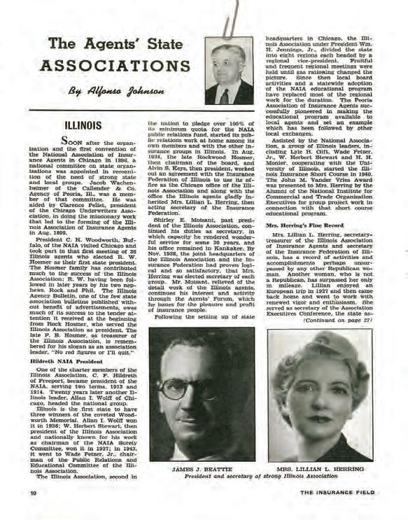 Lillian Herring, Acting Secretary of the Insurance Federation of Illinois, was named Secretary of the Illinois Association of Insurance Agents in 1938 and became the organization’s first paid Secretary. In 1942, Lillian Herring took over publication of the Bulletin from Shirley Moisant.