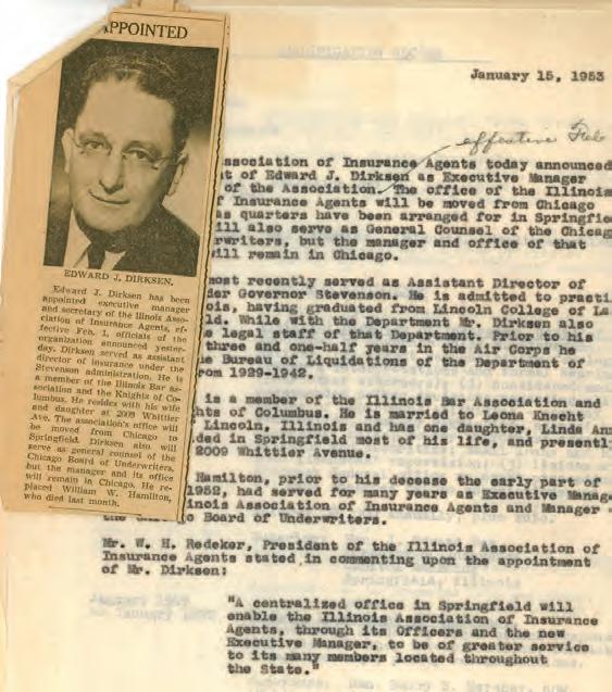 Edward Dirksen was named Executive Secretary in 1953 and he also served as general council for CBU. Dirksen spearheaded the association’s move from Chicago to the Ridgely Building in Springfield to better facilitate the focus on legislative matters. Upon his retirement in 1957, he returned to Springfield where he served briefly with the Illinois Department of Insurance. He had previously been Assistant Director of Insurance for the State of Illinois prior to taking the position at the Illinois Association of Insurance Agents.