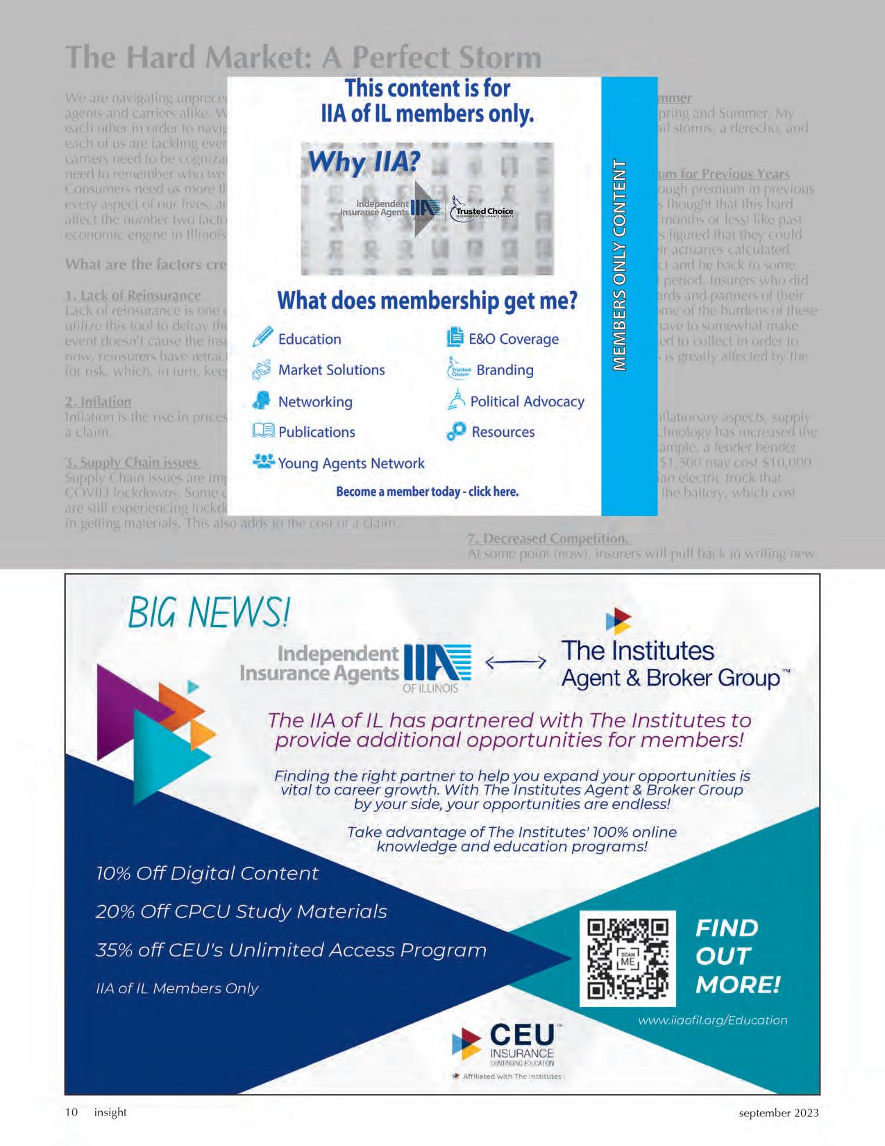 Trusted Choice Hard Market Toolkit Account Manager and CSR Roles and Performance By Catherine Oak & Bill Schoeffler How to Demonstrate ROI in Insurance Marketing By ONEFIRE Selling Insurance in a Hard Market By John Chapin CONVO 2023 Details - Refocus, Connect, Empower IIA of IL Hard Market Solutions for Agencies 12 13 15 16 18 20 23 24 26 32 The Independent Insurance Agents of Illinois (IIA of IL) has been providing members with a sustainable competitive advantage since 1899. Insight is the official publication of the Independent Insurance Agents of Illinois (IIA of IL). The magazine is published monthly for the members of the IIA of IL, with the office located at 4360 Wabash Avenue, Springfield, Illinois 62711-7009; Consumer Website: www.ChooseIndependent.com. The IIA of IL welcomes letters discussing concerns of the insurance industry, articles, editorials, other matters of interest to the membership. The editor reserves the right to edit and select submissions for publication. Address submissions for review to Rachel Romines at rromines@iiaofil.org. For advertising information, contact Tami Hubbell at thubbell@iiaofil.org. In This Issue President’s Message Brett’s 5 Sense e-Insight Associate News 9 10 19 28 info@iiaofil.org | www.iiaofil.org | (217) 793-6660 Editor & Graphic Design - Rachel Romines | Advertising - Tami Hubbell Agency Members in the News Outgoing IIA of IL Board Members Association Update IIA of IL News Classifieds 31 33 35 37 38 September 2023 2009 • 2010 • 2011 • 2012 • 2013 • 2014 • 2015 2016 • 2017 • 2019 • 2020 • 2021 • 2022 • 2023 15 12 16 26
