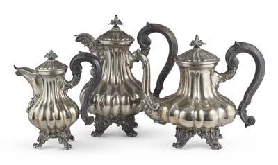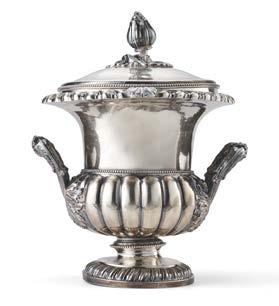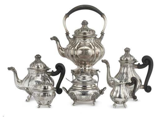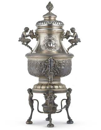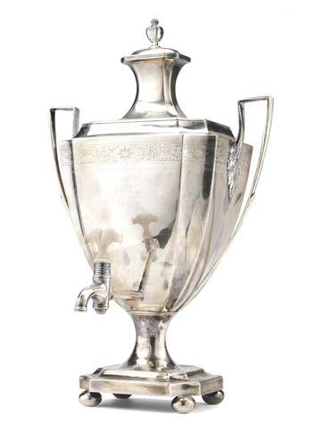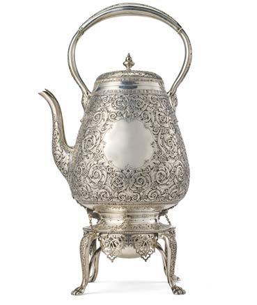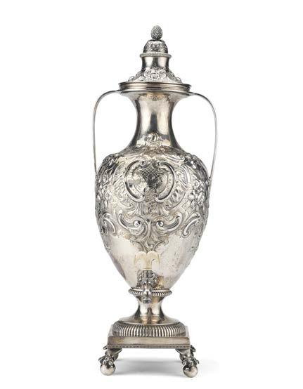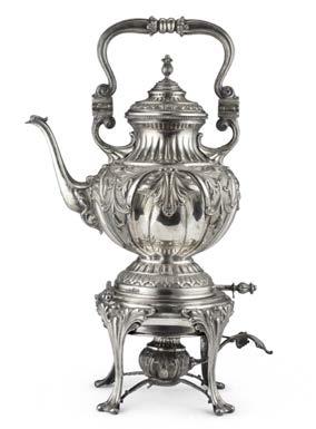 Teiera in argento riccamente incisa e sbalzata ad aquile, rami oriti e scena allegorica con vestali su base circolare, pro li perlinati. Reca iscrizione con dedicata datata 18 maggio 1830 entro cartiglio. Presa in legno sagomato ed ebanizzato. Londra, 1828. Argentiere John Kerschner (?) (g 1320) (h. cm 38) (difetti)
