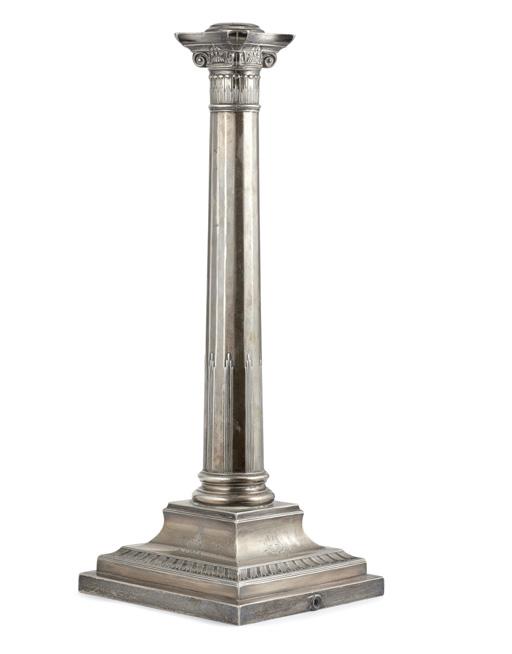 Candeliere in argento con fusto a colonna sfaccettata poggiante su base squadrata e appesantita, incisa con dedica recante data 1911 e stemmi nobiliari. Città di Sheffield, 1911. Argentiere non identificato (g lordi 3000) (h. cm 42,5) (difetti)