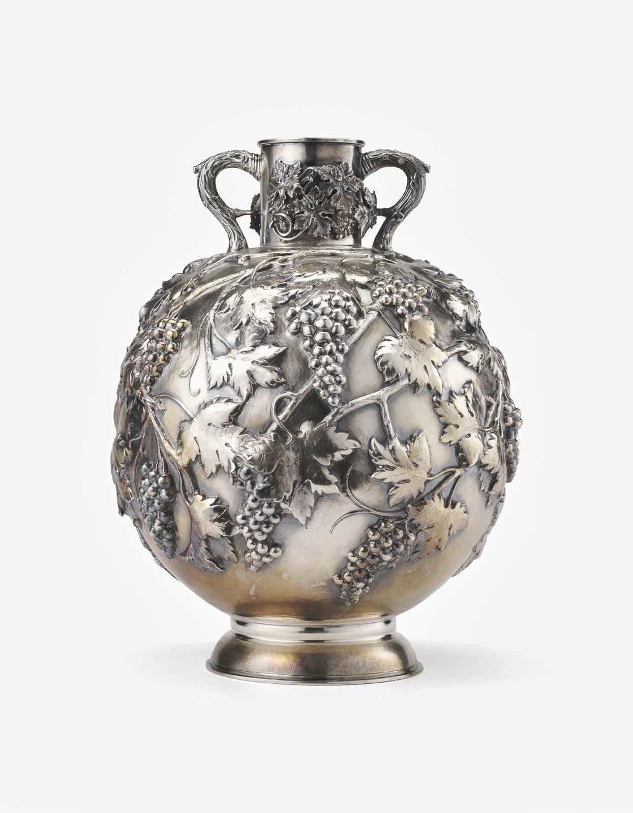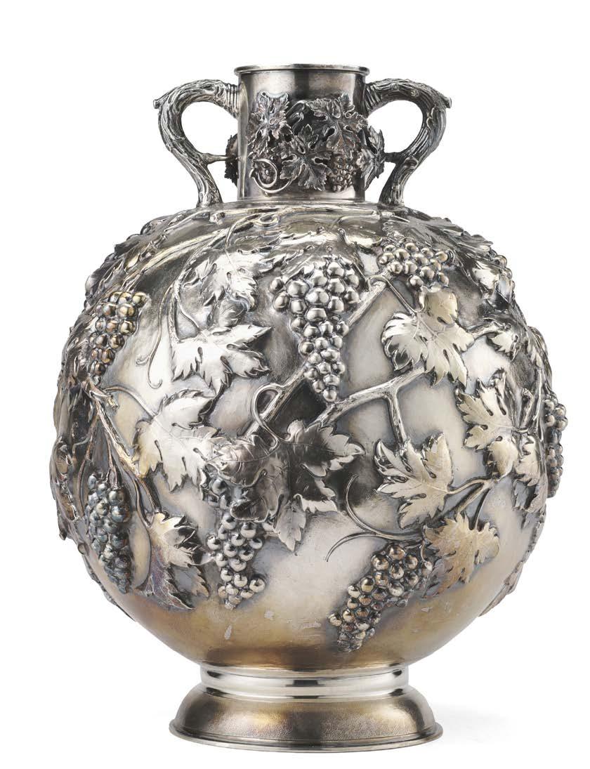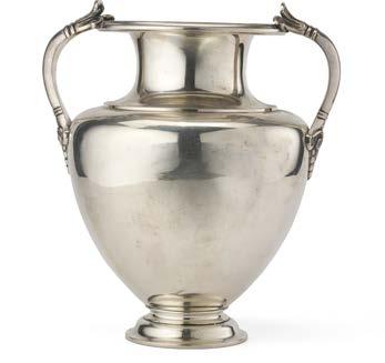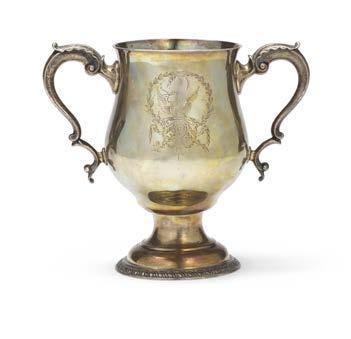 Coppa trofeo biansata in argento inciso con motto iscritto “VERITAS VINCIT” e monogramma coronato, anse a volute fogliate e base circolare gradinata con pro lo cordonato. Londra, 1767. Argentiere I.R. (g 800) (cm 23x20) (difetti)
