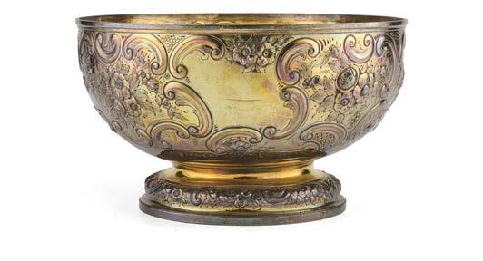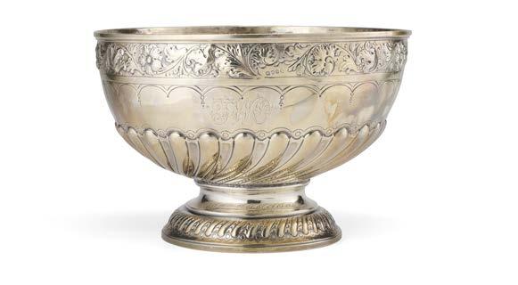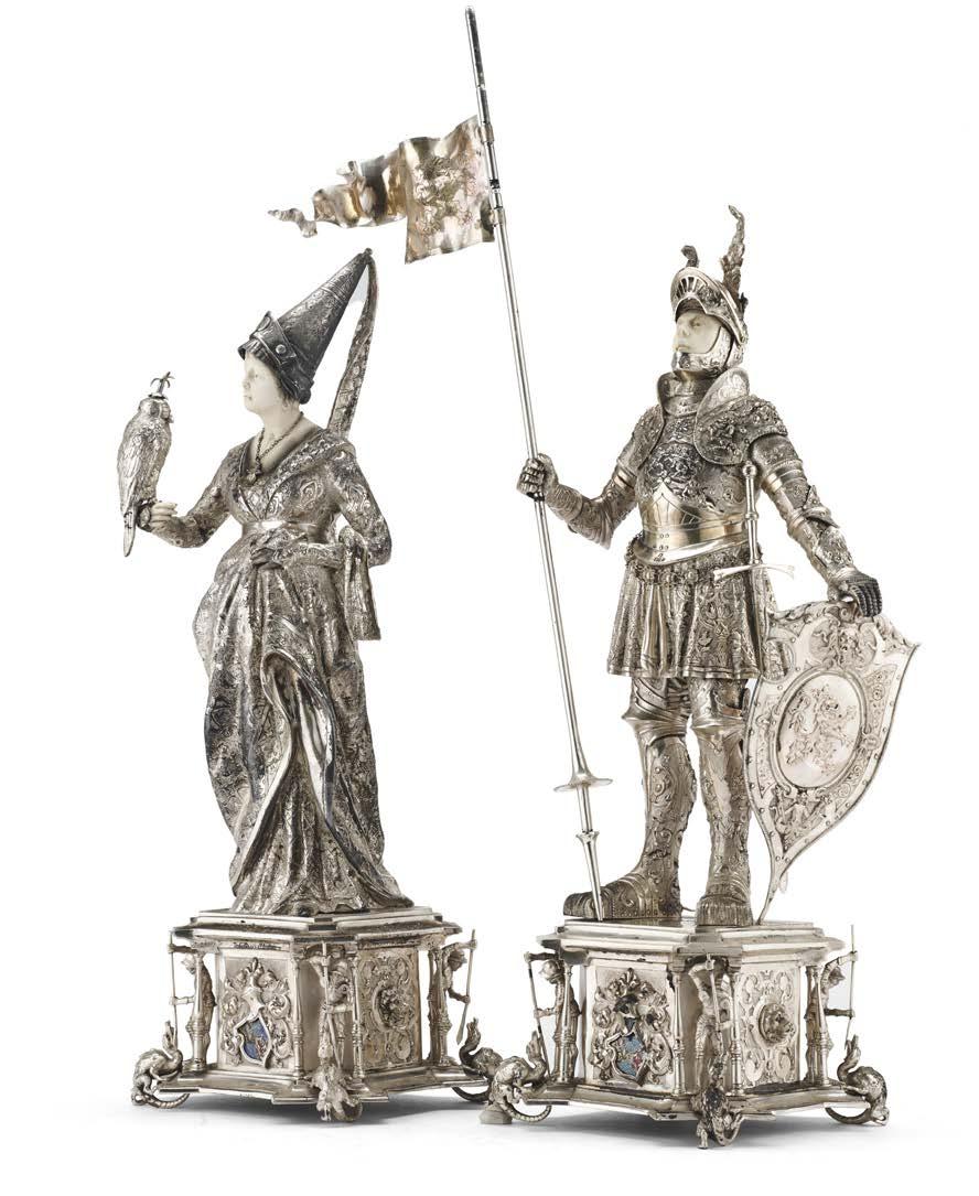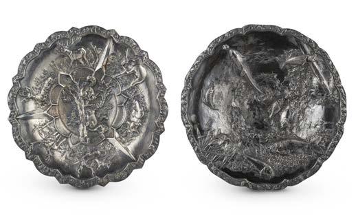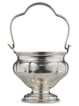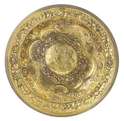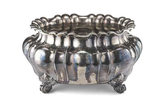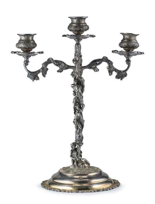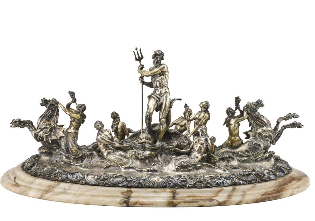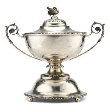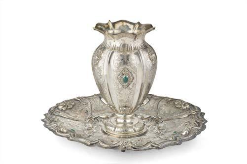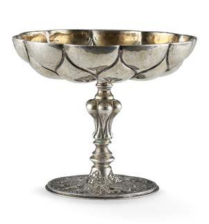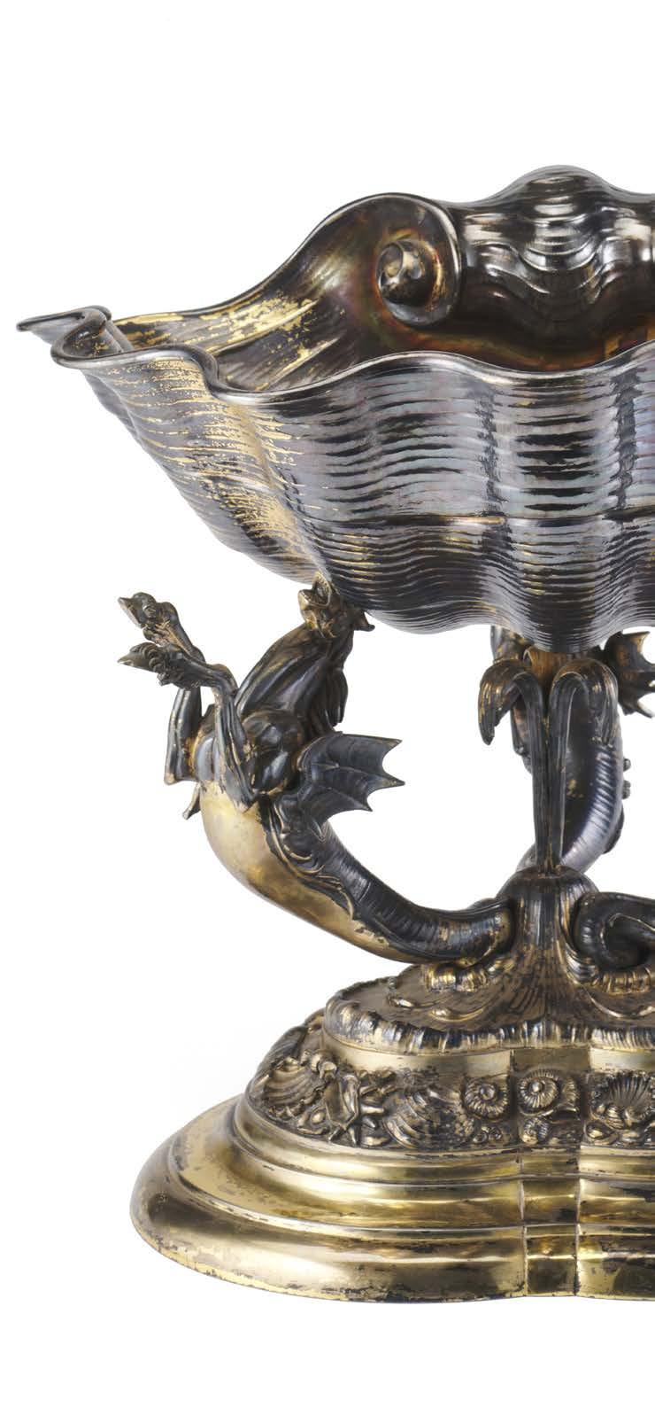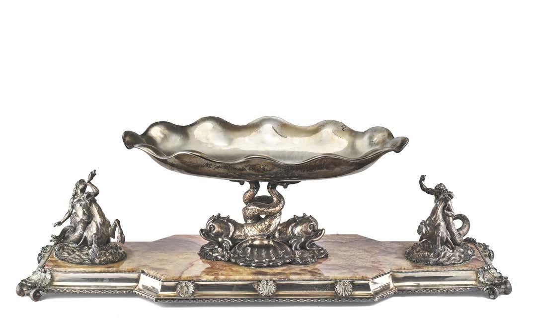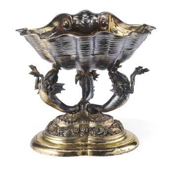 Alzata centrotavola in argento con piatto decorato a mascheroni, frutti ed elementi stilizzati nella falda e a medaglione e tritone con gure allegoriche nel cavetto. Montante a colonna con teste leonine, frutta e volute. Base circolare a mascheroni e baccellature. Austria, inizio secolo XX (g 740) (h cm 27, d. cm 28) (difetti)