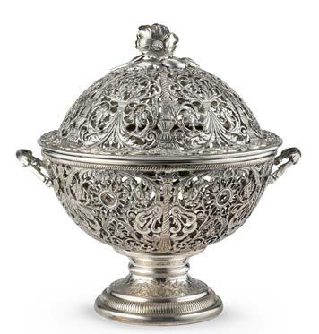 Coppa biansata in argento con coperchio incisa e traforata con decoro oreale, presa a ore a tutto tondo, vasca interna a corpo liscio. Roma, secolo XX. Argentiere Gasponi (g 600) (cm 21x21) (difetti)