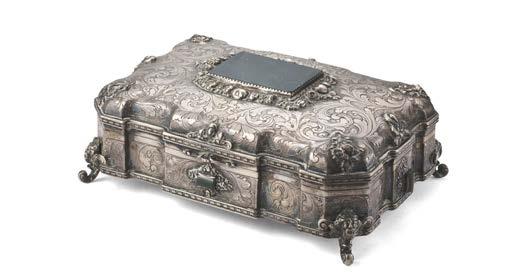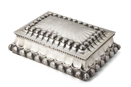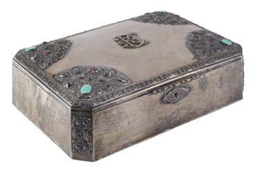 Cofanetto portagioie in argento con coperchio e anchi incisi e decorati in rilievo a volute e ori e inserti in diaspro sanguigno.