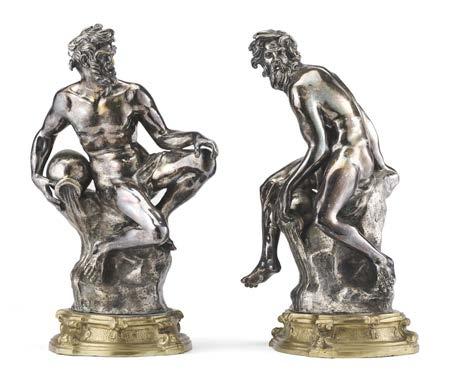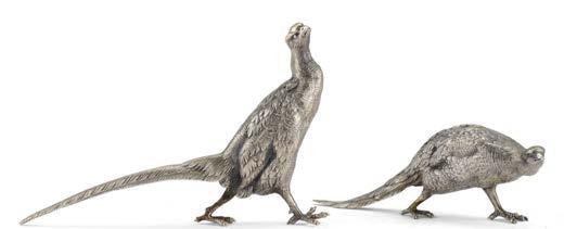 Due gure di fagiano in argento fuso e inciso. Milano, secolo XX. Argentiere Miracoli (g 500) (L. max cm 19) (lievi difetti)