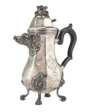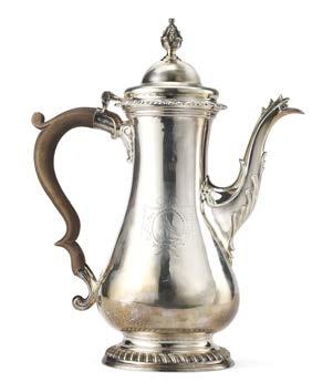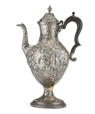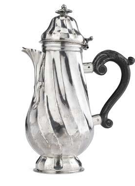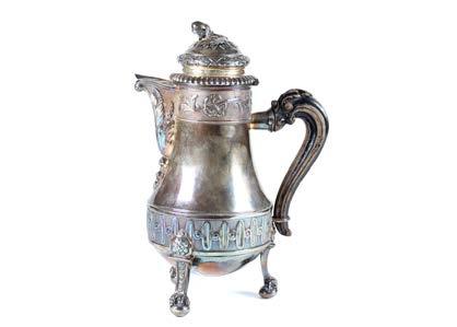 Caffettiera in argento decorata a sbalzo da baccellature e motivi vegetali, coperchio con presa a tutto tondo in foggia di ghianda, base a decori geometrici, piedi ferini che trattengono sfera, ansa in legno ebanizzato. Inizio secolo XIX, punzoni di importazione francesi (1819-1838) (g lordi 750) (h. cm 27) (difetti)